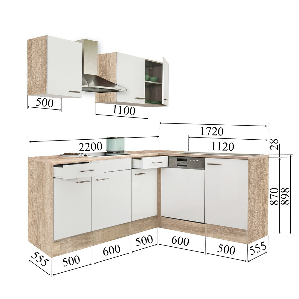 Setul de mobilă de bucătărie de colț Yorki 220 îmbină aspectul cald de stejar Sonoma cu fronturi alb satinat, oferind un look modern și ușor de integrat în bucătăriile din România. Construcția modulară te ajută să folosești eficient colțul încăperii, iar blatul de lucru generos susține activitățile zilnice de gătit.