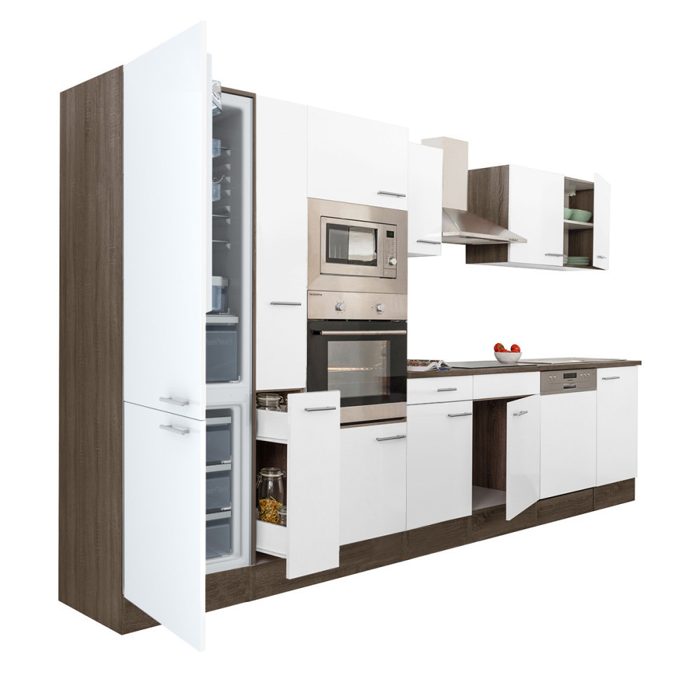 Transformă bucătăria într-un spațiu ordonat și plăcut cu mobilă de bucătărie Yorki 370 cm de la Leziter, cu corp în nuanță de stejar Yorki și fronturi alb satinat. Configurația este gândită pentru depozitare generoasă și pentru integrarea electrocasnicelor, inclusiv frigider cu congelator în partea de jos, oferind o linie curată și un aspect unitar.