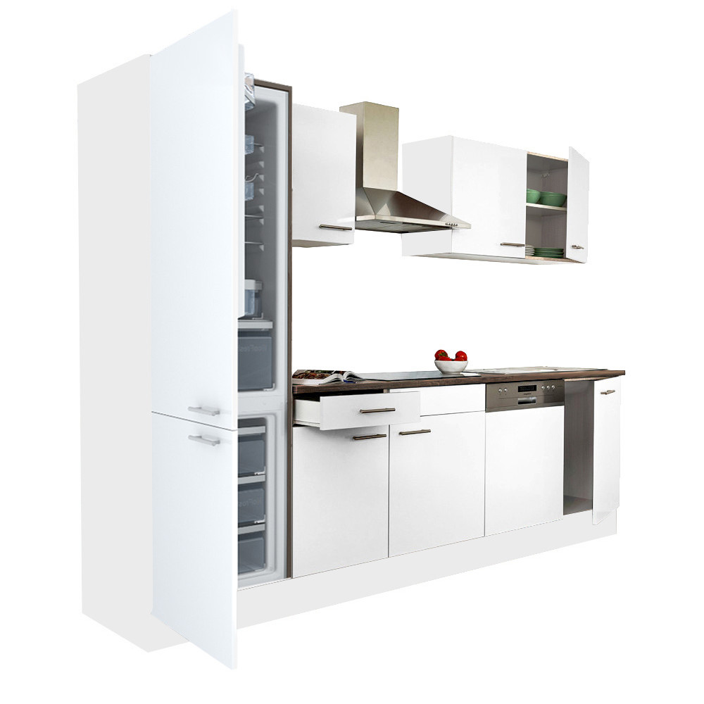 Alege setul de mobilă de bucătărie Yorki 280 cm de la Leziter dacă îți dorești o bucătărie luminoasă, ușor de integrat în orice amenajare. Combinația de corp alb și fronturi alb satinat oferă un look modern, iar configurația modulară te ajută să adaptezi elementele după spațiul disponibil.