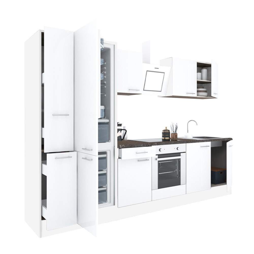 Mobilă de bucătărie modulară Leziter Yorki 300 cm, alb satinat, cu corp cuptor și coloană frigider