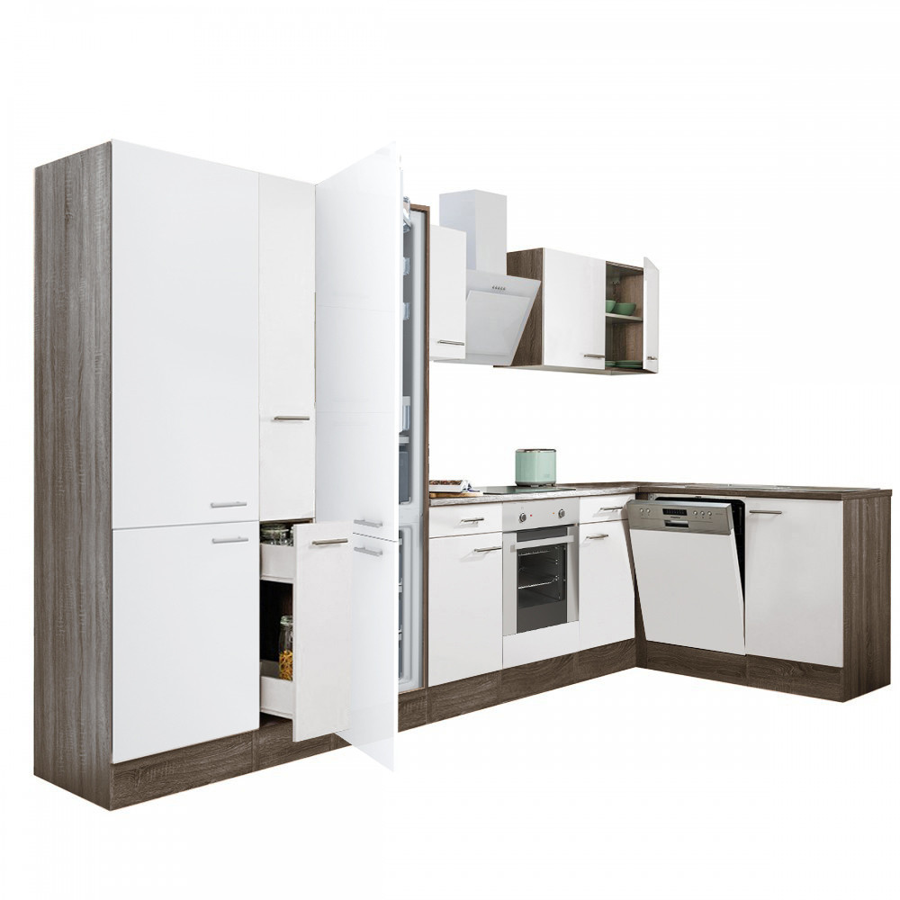 Mobilă de bucătărie pe colț Yorki 370 cm, stejar Yorki și alb satinat, cu dulap rafturi
