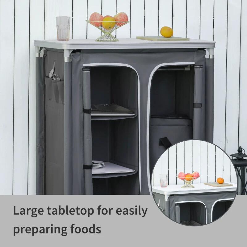 Mobilier camping, portabil, aluminiu, poliester, masa blat MDF, impermeabil, 3 rafturi, dulap, max 45 kg, 96x49.5x104 cm