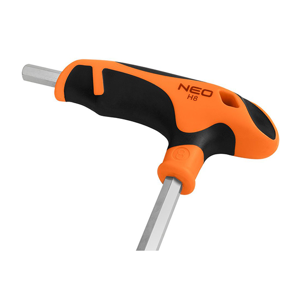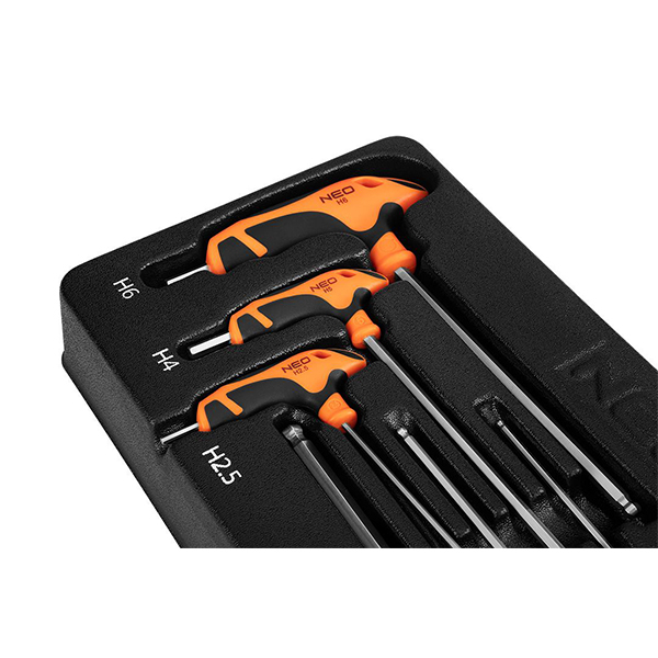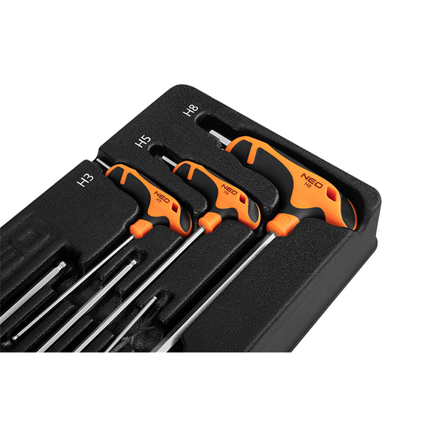 - Set complet de chei HEX oferit pentru dulapurile de atelier marca NEO. Sculele sunt fabricate din otel S2 de inalta calitate si manere bicomponente, afectand un confort mai mare de utilizare. Acestea sunt destinate utilizarii in atelierele de mecanica si in serviciile de reparatii. Setul este alcatuit din opt chei cu cheie in urmatoarele dimensiuni: H2,5, H3, H4, H5, H6, H8. Datorita insertiei profilate, este posibila pastrarea uneltelor in perfecta ordine. Cheile sunt concepute pentru cel mai mare confort de utilizare.