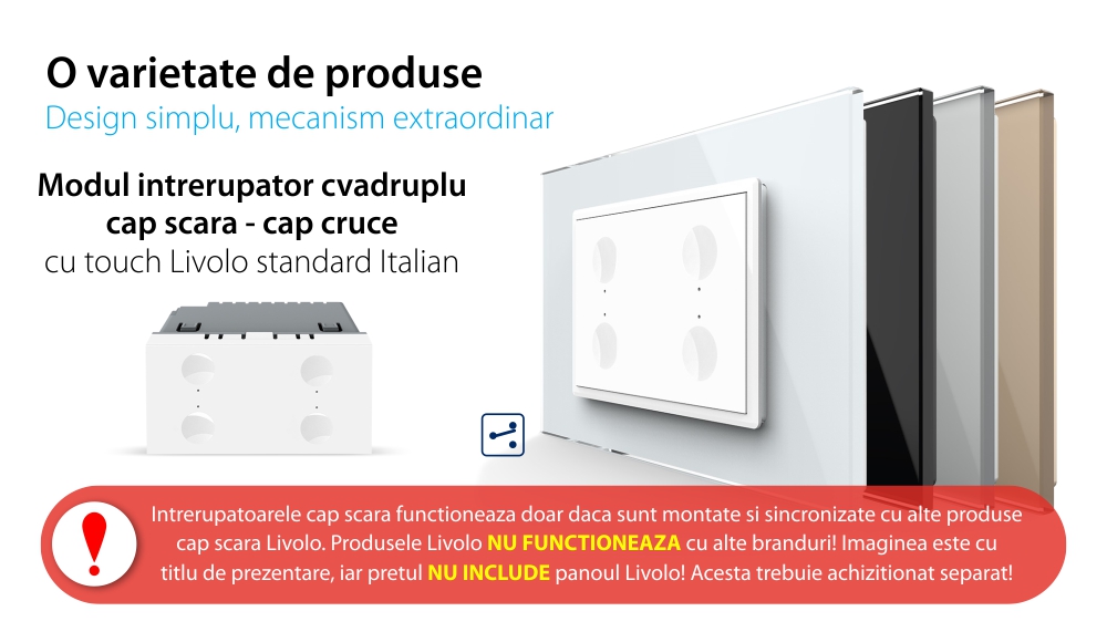 Modul intrerupator cvadruplu cap scara / cap cruce cu touch Livolo standard Italian, Serie noua SmartElectro IntelligentHouse