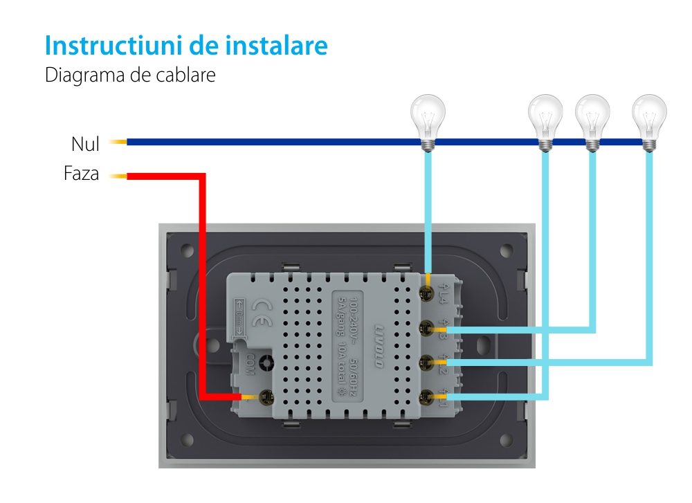 Specificatii Modul intrerupator cvadruplu touch Livolo standard