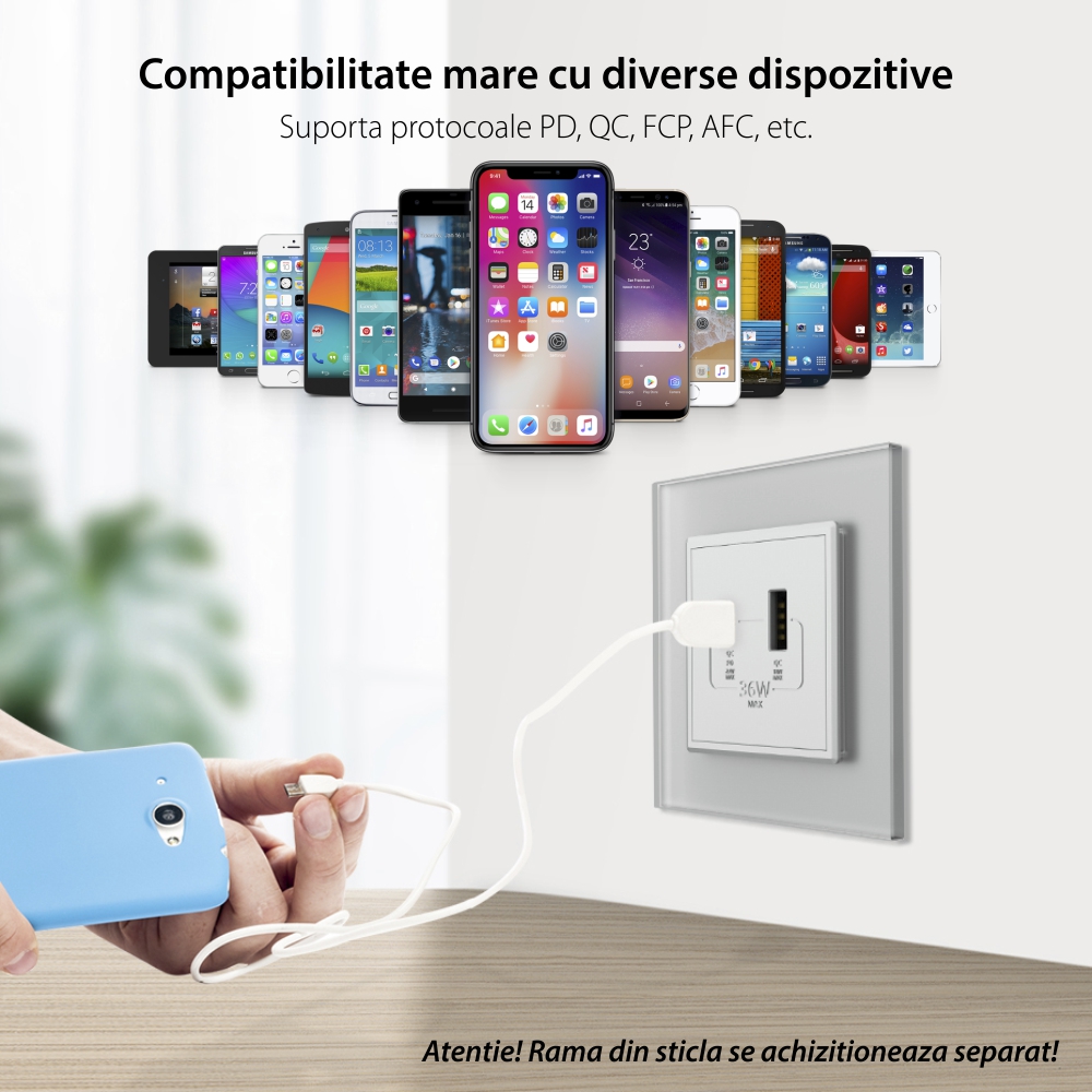 Modulul priza are doua porturi de incarcare cu o putere totala de 36W. Cand portul A si portul C sunt conectate in acelasi timp, acestea pot scoate simultan pana la 18W fiecare. Priza accepta protocoale PD, QC, FCP, AFC, APPLE 5V/2.4A, BC1.2 DCP etc. Priza va determina automat cea mai buna metoda de incarcare pentru dispozitivele conectate. Se monteaza in doza rotunda sau patrata cu distanta dintre suruburi 60 mm.