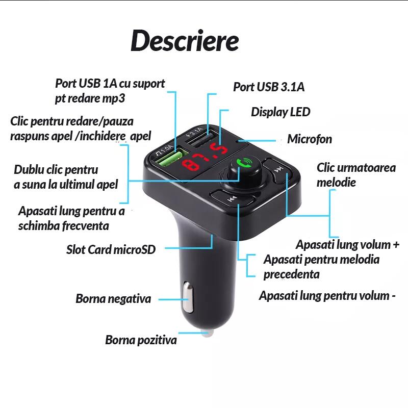 Descriere Modulator FM, Bluetooth 5.0, Dual USB,