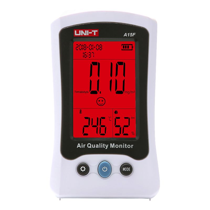 Uni-T A15F este un monitor de calitate a aerului care masoara in timp real formaldehida (HCHO), impreuna cu temperatura si umiditatea. Este ideal pentru locuinte, birouri, spatii comerciale sau autoturisme, atunci cand vrei sa verifici rapid nivelul de confort si siguranta al aerului.