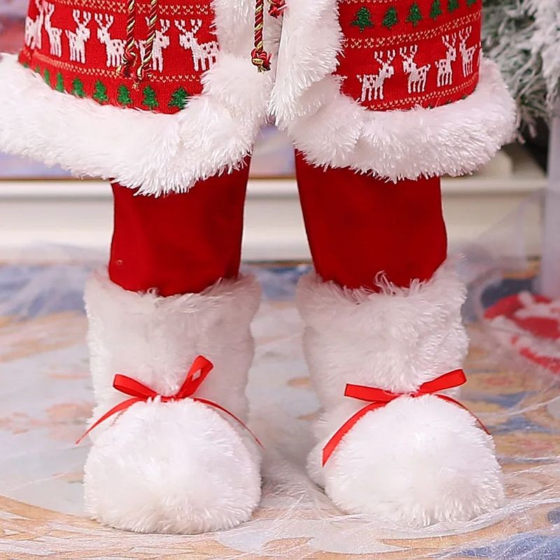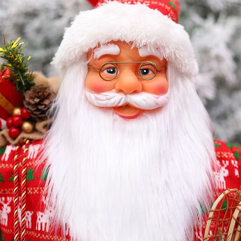 Inaltimea totala a figurinei este de 60 cm, este confectionata din plastic si material textil placut la atingere, intr-o combinatie de rosu, blanita alba si imprimeu cu motive specifice: reni si brazi. Imbracamintea, caciula cu clopotel, ochelarii si saculetul cu cadouri sunt accesorii suplimentare care ofera un aspect realist figurinei.