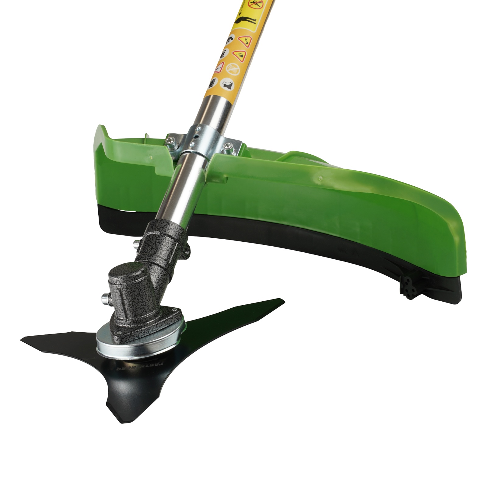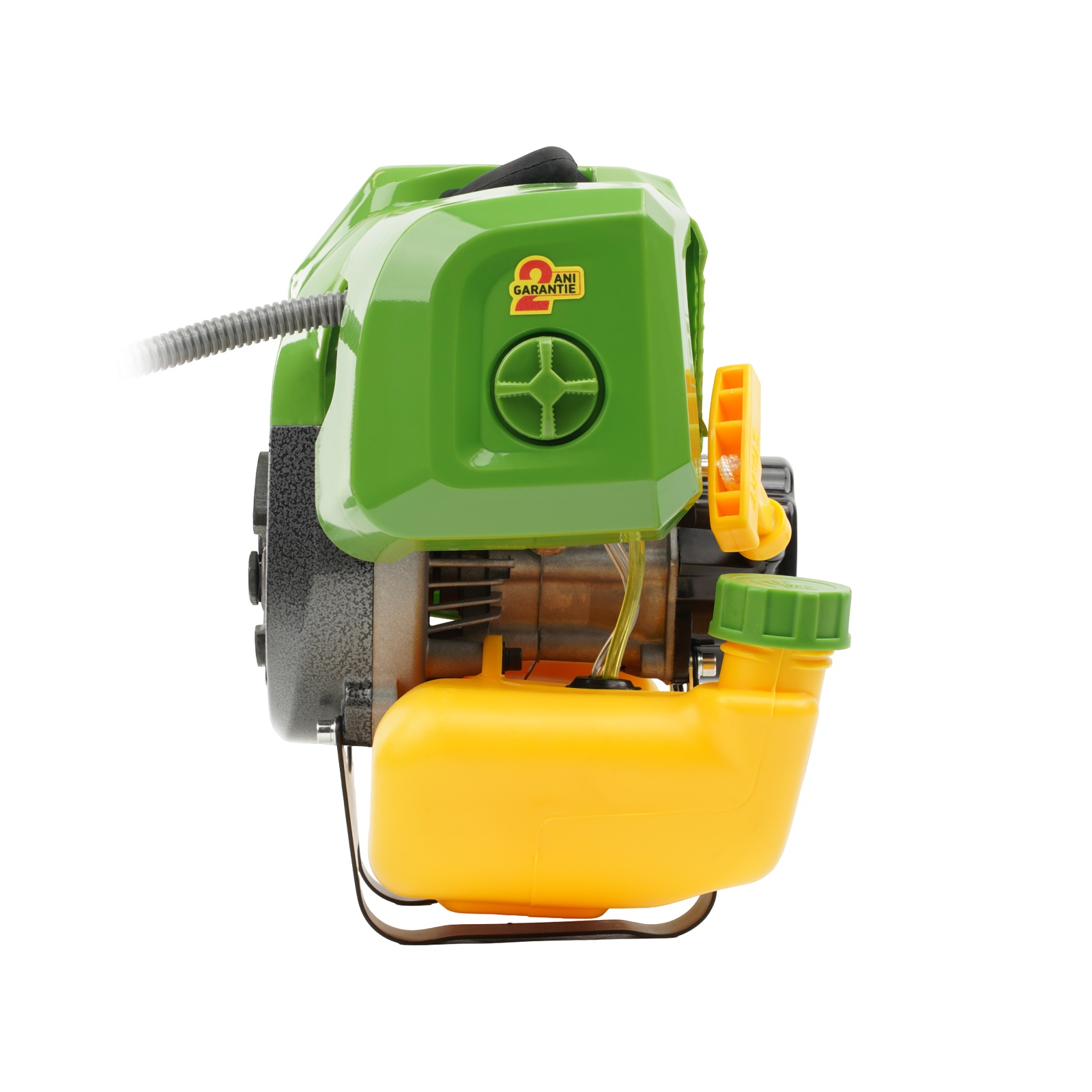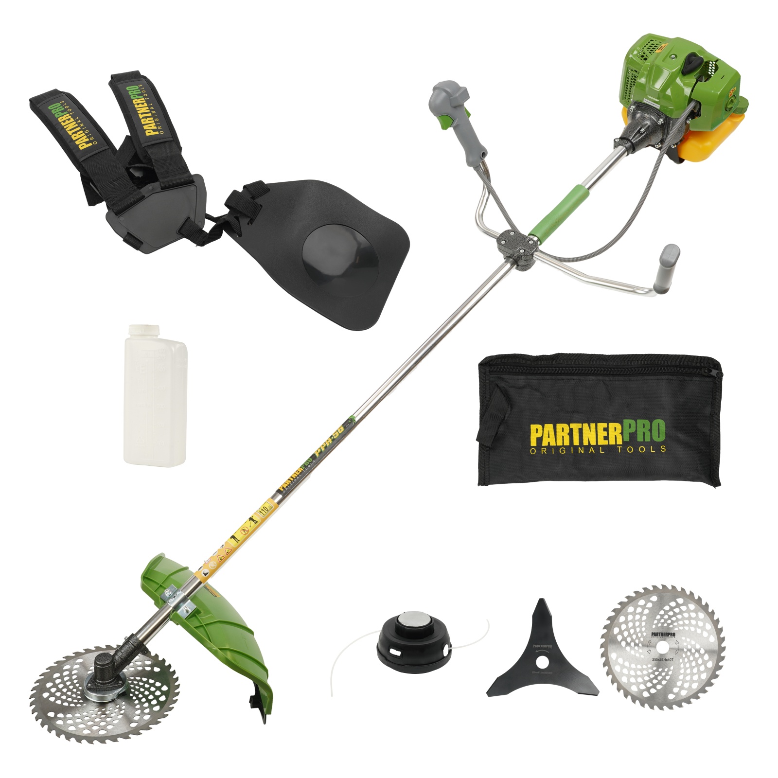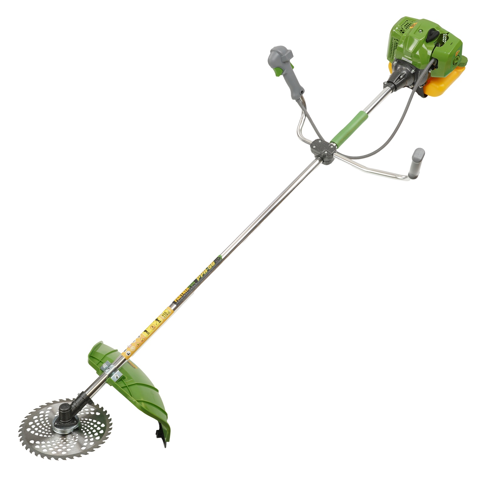 Motocoasa 2T benzină PARTNERPRO PPA-56 Motocoasa pe benzină PartnerPro PPA-56 este alegerea ideală pentru cei care caută putere, fiabilitate și versatilitate într-o singură unealtă. Cu un motor de 5.8 CP și o putere totală de 5600W, acest model este perfect pentru cosirea vegetației dense, a ierbii înalte sau a arbuștilor, în grădină, livadă sau pe terenuri dificile. Turația de 10.000 rotații pe minut asigură un randament ridicat, iar motorul în 2 timpi cu cilindree de 52CC garantează o funcționare optimă și constantă. Designul ergonomic cu mâner confortabil, hamul dublu pentru distribuirea echilibrată a greutății și sistemul anti-vibrații fac ca utilizarea să fie ușoară chiar și în sesiunile de lucru îndelungate. Este un instrument indispensabil pentru grădinarii pasionați, dar și pentru cei care au nevoie de performanță în condiții solicitante. Detalii Tehnice: Putere motor: 5.8 CP / 5600W Motor în 2 timpi, cilindree 52CC Turație maximă: 10.000 rot/min Rezervor combustibil: 1.2 litri, volum generos pentru autonomie crescută Demaror manual și aprindere fără contact Filtru de aer: protejează motorul împotriva impurităților Mâner ergonomic pentru control sigur Ham dublu pentru susținere confortabilă Reductor rezistent la uzură Cruce de îmbinare anti-vibrații Apărătoare de protecție pentru tăiere în siguranță Latime de tăiere cu fir: 400 mm Diametru de taiere : 255mm Fir de tăiere: Ø 2.3 mm Disc 3T pentru arbuști și lăstari: 255 mm Disc vidia 40T pentru vegetație dură: 255 mm Limitator de fir: protejează motorul de suprasarcină Conținut pachet: Motocoasa PartnerPro PPA-56 1x Cap mosor cu fir 1x Disc metalic 3T 1x Disc vidia 40T pentru vegetație densă 1x Set de unelte pentru întreținere 1x Ham dublu pentru confort și susținere 1x Bidon pentru amestec carburant Manual de utilizare - 1x Bidon amestec