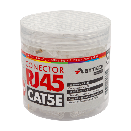 Conector RJ45 cat. 5e neecranat. 8 pini din cupru, nichelati si auriti 50 microni, pentru o protectie si viteza de transmisie exceptionala. Unitate de ambalare: borcan 100 bucati.