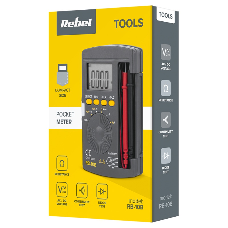 Multimetrul de buzunar Rebel este alegerea potrivita cand ai nevoie de un aparat mic, usor de purtat si simplu de folosit pentru verificari rapide. Cu functii pentru tensiune AC/DC, rezistenta, capacitate, frecventa si teste de continuitate si dioda, te ajuta sa depistezi rapid problemele in instalatii si circuite.