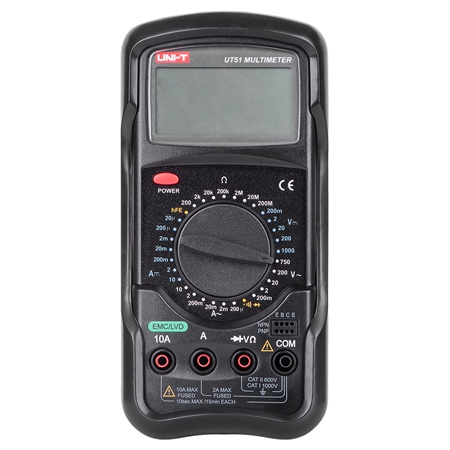 Multimetrul digital UNI-T UT51 este o alegere practică pentru măsurători electrice precise în atelier, service sau pentru utilizatori tehnici care au nevoie de un aparat fiabil și ușor de folosit. Acest multimetru digital permite măsurarea tensiunii continue și alternative, a curentului continuu și alternativ, a rezistenței, dar și verificarea diodelor, continuității și a factorului de amplificare pentru tranzistoare hFE.