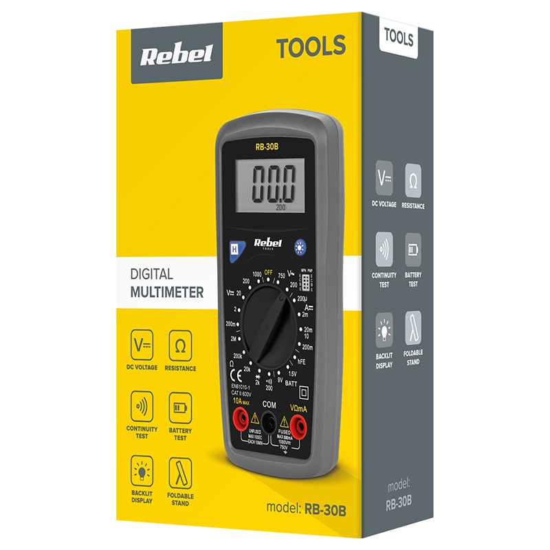 Multimetrul Rebel RB-30B este un aparat practic pentru măsurători rapide în casă, atelier sau service. Oferă citiri clare pe afișaj iluminat și selecție manuală a domeniilor, fiind potrivit pentru verificarea instalațiilor, bateriilor și componentelor electronice.