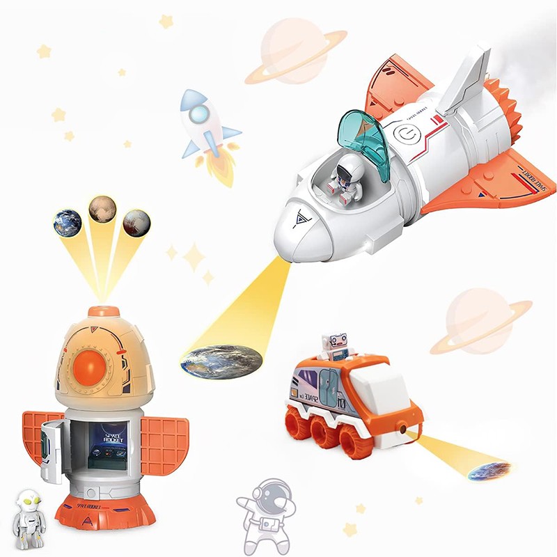 - include o nava spatiala cu functie de proiectie, vehicul de lansare, satelit, vehicul terestru, rover, 3 figurine astronaut;
