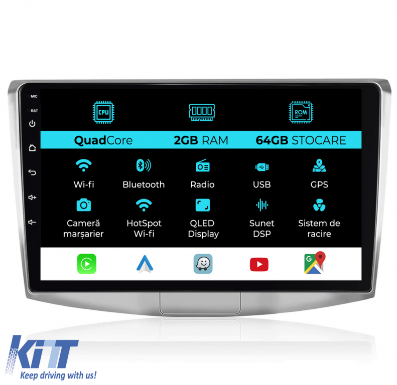 Sistem de operare: Android 13 Procesor: Quadcore Memorie RAM: 2GB Stocare interna (ROM): 64GB Dimensiune Display: 10 Inch Rezolutie ecran: 1280x720p Bluetooth: Bluetooth pentru apeluri, descarcare agenda telefonica si redare muzica WiFi: Da (Integrat) Slot Sim 4G: Nu Conectivitate retea: Hotspot telefon, router extern, dongle 3G sau 4G, CarPlay Android Auto Microfon: Microfon integrat, cu posibilitate de conectare microfon extern Alimentare: 12V Putere audio: 4x45W Egalizator DSP: Procesor de sunet digital (DSP EQ) Compatibilitate USB SD: Compatibil cu USB de pana la 128GB, suport SD prin adaptor USB Compatibilitate aplicatii Android: Compatibil cu majoritatea aplicatiilor Android din Google Play Compatibilitate CarPlay si Android Auto: Da, compatibil cu iOS (CarPlay) si Android (Android Auto) Suport pentru limbi:a Romana, Engleza, Maghiara, Spaniola, Italiana, Germana, etc. Tip ecran: TouchScreen capacitiv, multi-touch, IPS Setari luminozitate: Da Radio RDS: Da Iesire subwoofer RCA: Da Iesire video RCA: Da, cu ajutorul unui adaptor USB Iesire audio RCA: Da GPS: Da, (Google Maps, Waze, HereWeGo) Senzori de parcare: Da (Preluare senzori de parcare cu afisaj unde este cazul) Control volan: Da (Preluare comenzi volan cu canbus sau analogic unde este cazul) Compatibilitate camera DVR: Da Compatibilitate camera marsarier: Da Manual de utilizare: Da Continut pachet: Navigatie Android Rama adaptoare Cablaj de alimentare Antena GPS Conectori RCA Cablaj pentru camera de marsarier, 2 cabluri USB Canbus (doar daca este cazul) Certificat de garantie Factura fiscala Navigatia este compatibila cu urmatoarele marci auto : VOLKSWAGEN: Passat B6 (2005 - 2011) Passat B7 (2011 - 2015) Passat CC (2008 - 2015)