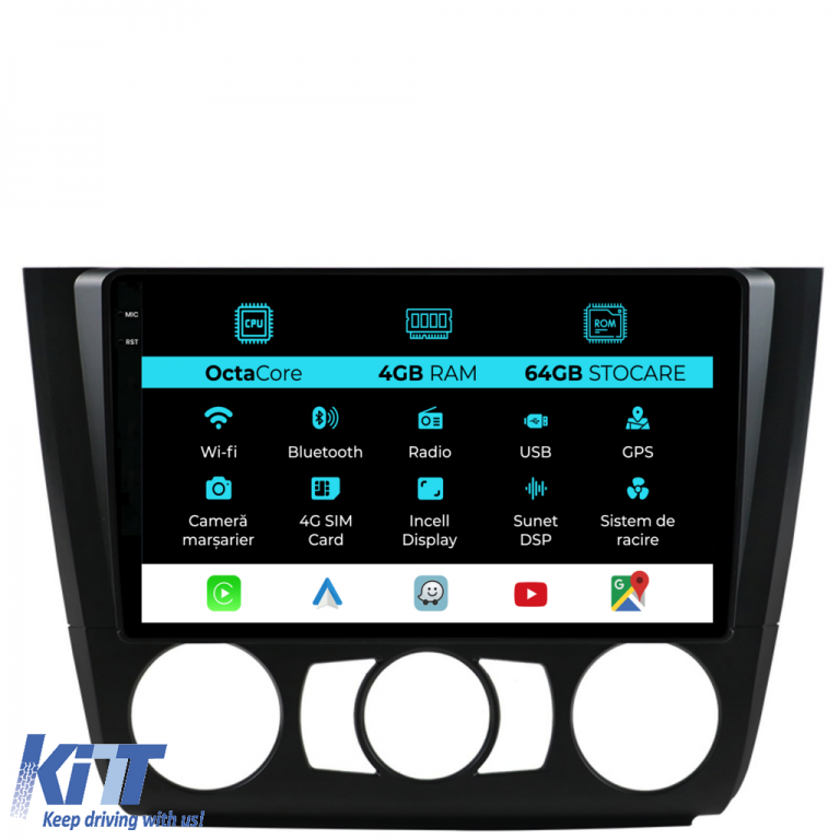 Sistem de operare: Android 13 Procesor: Octa-core Memorie RAM: 4GB Stocare interna (ROM): 64GB Dimensiune Display: 9 Inch Rezolutie ecran: 1360x800p Bluetooth: Bluetooth pentru apeluri, descarcare agenda telefonica si redare muzica WiFi: Da (Integrat) Slot Sim 4G: Da Conectivitate retea: 4G, Hotspot telefon, router extern, dongle 3G sau 4G, CarPlay Android Auto Microfon: Microfon integrat, cu posibilitate de conectare microfon extern Alimentare: 12V Putere audio: 4x45W Egalizator DSP: Procesor de sunet digital (DSP EQ) Compatibilitate USB SD: Compatibil cu USB de pana la 128GB, suport SD prin adaptor USB Compatibilitate aplicatii Android: Compatibil cu majoritatea aplicatiilor Android din Google Play Compatibilitate CarPlay si Android Auto: Da, compatibil cu iOS (CarPlay) si Android (Android Auto) Suport pentru limbi:a Romana, Engleza, Maghiara, Spaniola, Italiana, Germana, etc. Tip ecran: TouchScreen capacitiv, multi-touch, IPS Setari luminozitate: Da Radio RDS: Da Iesire subwoofer RCA: Da Iesire video RCA: Da, cu ajutorul unui adaptor USB Iesire audio RCA: Da GPS: Da, (Google Maps, Waze, HereWeGo) Senzori de parcare: Da (Preluare senzori de parcare cu afisaj unde este cazul) Control volan: Da (Preluare comenzi volan cu canbus sau analogic unde este cazul) Compatibilitate camera DVR: Da Compatibilitate camera marsarier: Da Manual de utilizare: Da Continut pachet: Navigatie Android Rama adaptoare Cablaj de alimentare Antena GPS Antena 4G Conectori RCA Cablaj pentru camera de marsarier, 2 cabluri USB Canbus (doar daca este cazul) Certificat de garantie Factura fiscala Navigatia este compatibila cu urmatoarele marci auto : BMW: Seria 1 E82 E88 E81 E87 (2004-2011)