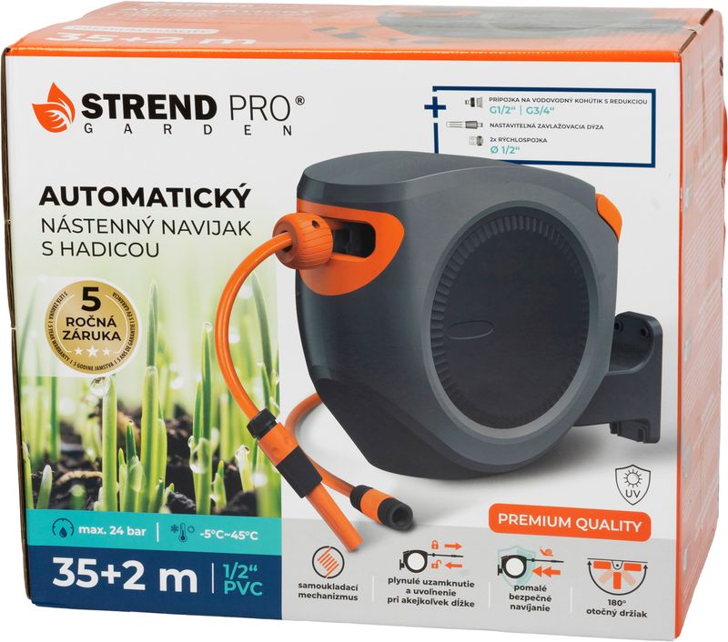 Automatický nástenný navijak Strend Pro Premium s 35+2 m záhradnou hadicou je praktickým riešením pre pohodlné zavlažovanie záhrady, dvora alebo terasy. Vďakaautomatickému navíjaciemu mechanizmuzabezpečujejednoduchú manipuláciua zabraňuje zamotaniu hadice.Robustná konštrukcia a kvalitné materiályzaručujúdlhú životnosťa odolnosť voči poveternostným podmienkam. Možnosť upevnenia na stenu šetrí priestor a umožňujejednoduché skladovanie. Hadica s dĺžkou 35 metrov poskytuje dostatočný dosah pre väčšinu záhradných potrieb, pričom dodatočné 2 metre uľahčujú pripojenie k vodovodnému zdroju. Ideálne riešenie pre efektívne a komfortné zavlažovanie.