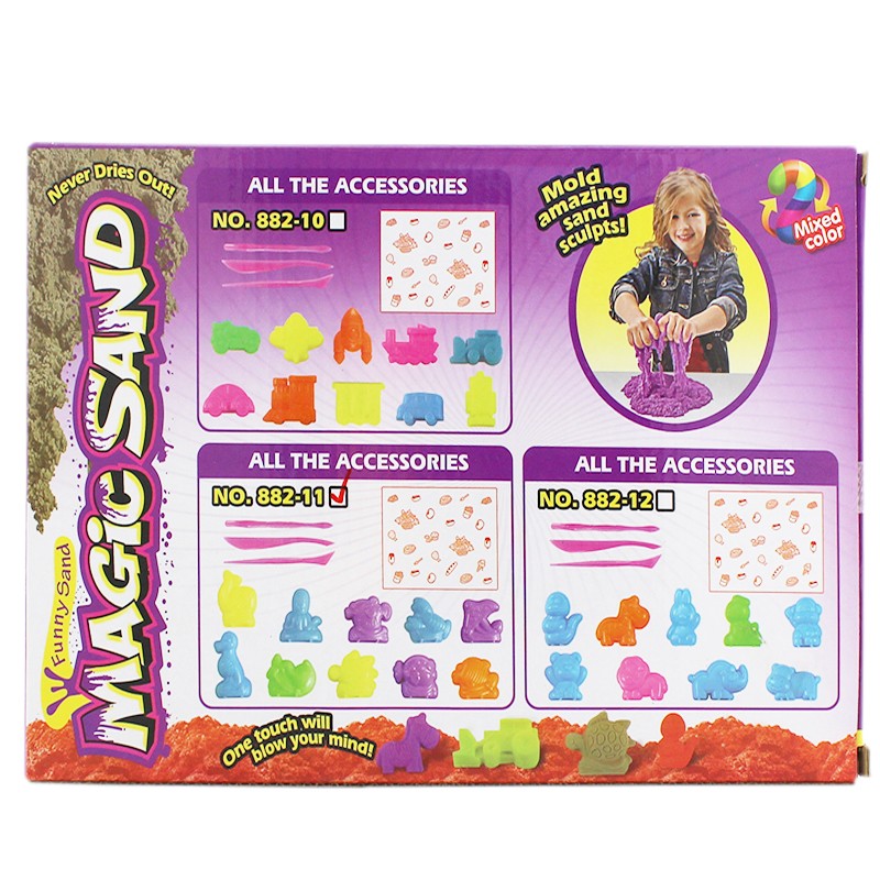 Pachetul include 500g de nisip, diferite forme pentru nisip si o folie pentru protejarea suprafetei de joc.