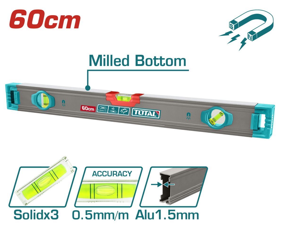 Obtii masuratori corecte din prima cu nivela magnetica TOTAL de 60 cm, gandita pentru lucrari de montaj si finisaje. Cei 3 magneti puternici o fixeaza rapid pe profile metalice, iar constructia din aluminiu cu profil de 1,5 mm rezista bine in timp.