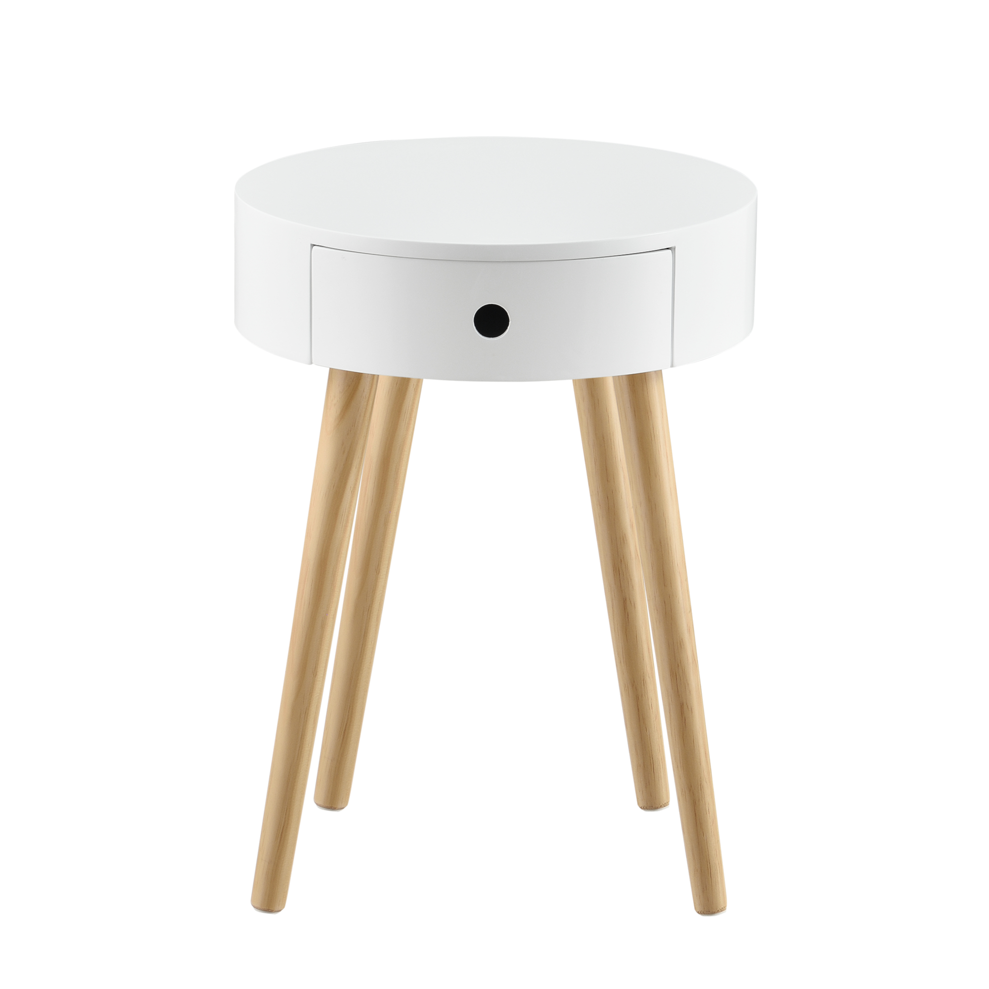 Noptiera Aurich aduce un plus de stil și funcționalitate în dormitor, living sau camera de oaspeți. Cu un aspect modern inspirat din stilul retro, această noptieră albă cu sertar se remarcă prin forma rotundă elegantă și picioarele din lemn, fiind potrivită atât lângă pat, cât și ca măsuță laterală decorativă.