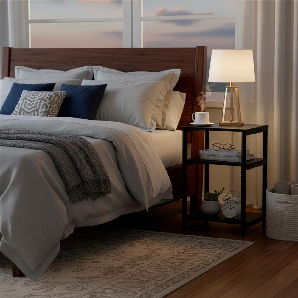 - In dormitor, langa pat, pentru lampa, telefon, ceas sau carti