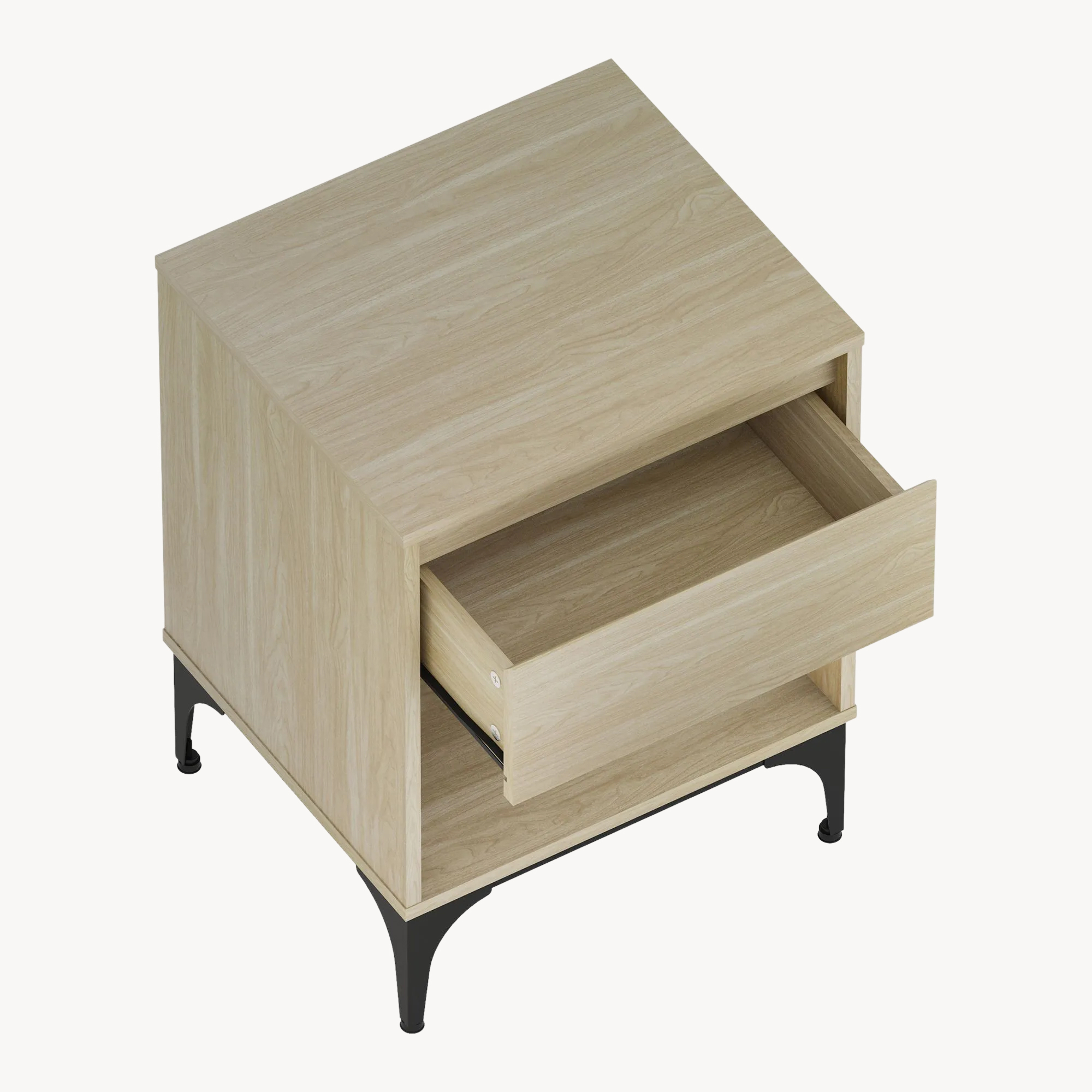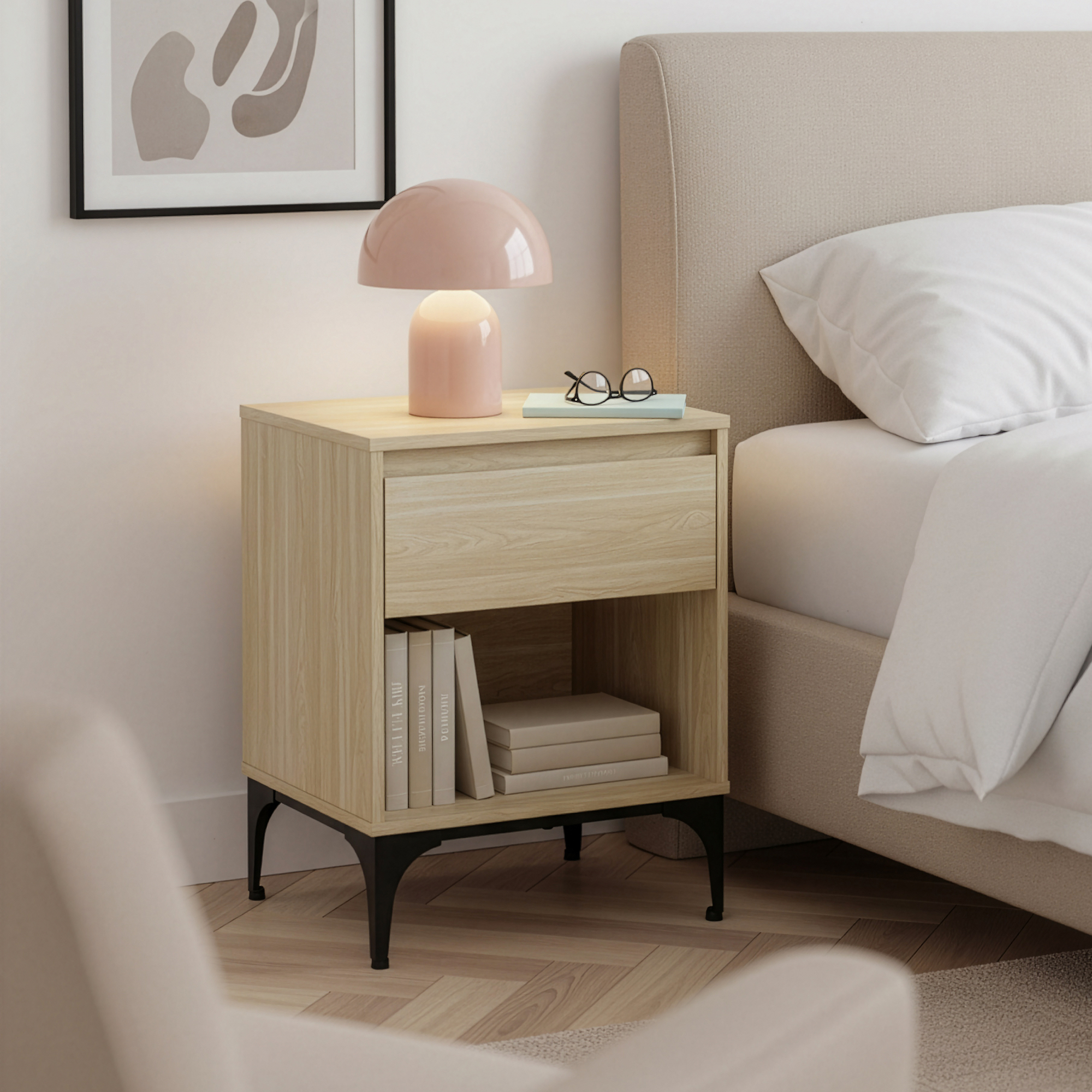 Noptieră Kistiandi – o alegere practică și elegantă pentru un dormitor, living sau hol amenajat cu bun gust. Finisajul în stejar deschis aduce un aspect cald și luminos, iar picioarele metalice negre completează designul modern, ușor de integrat în diverse stiluri de mobilier.