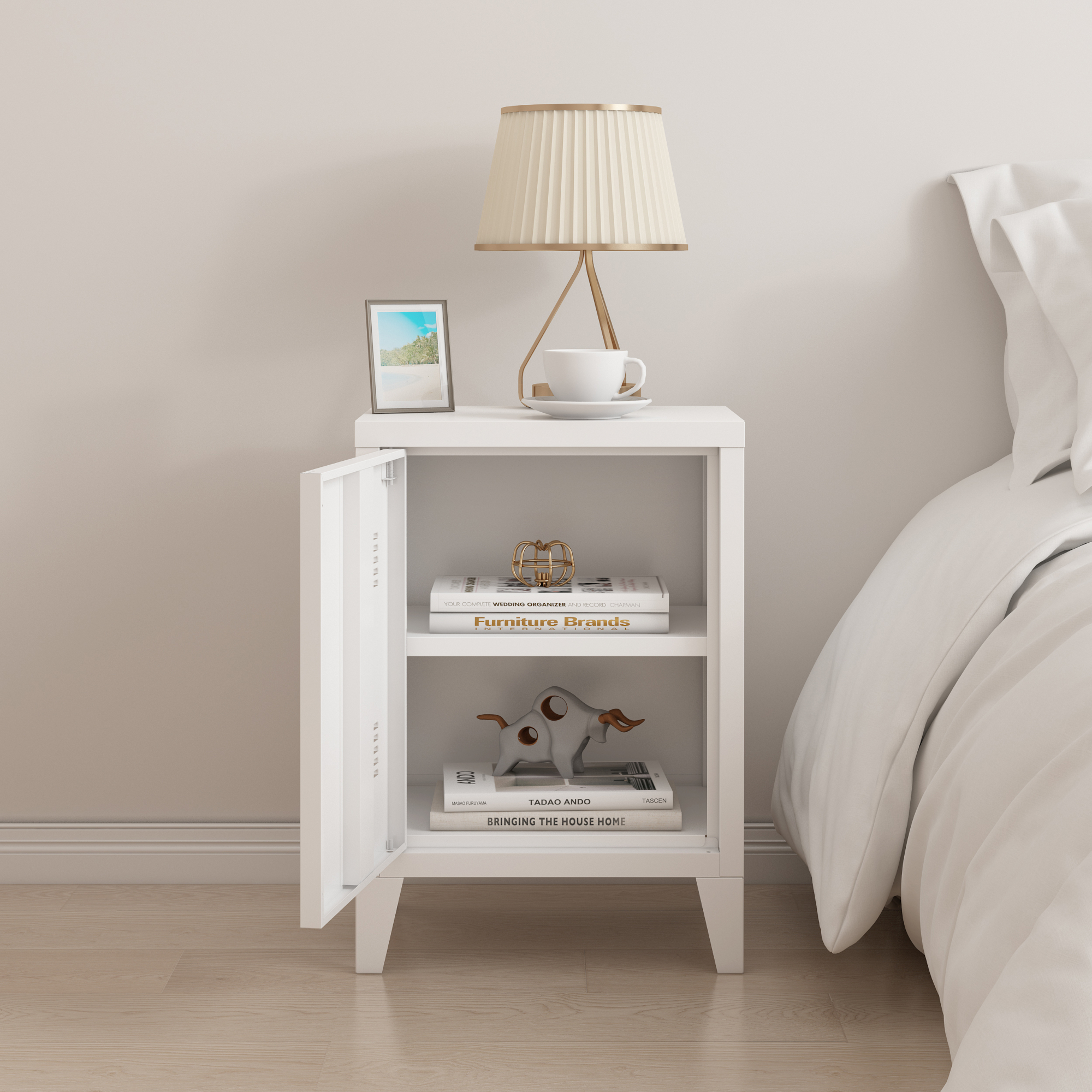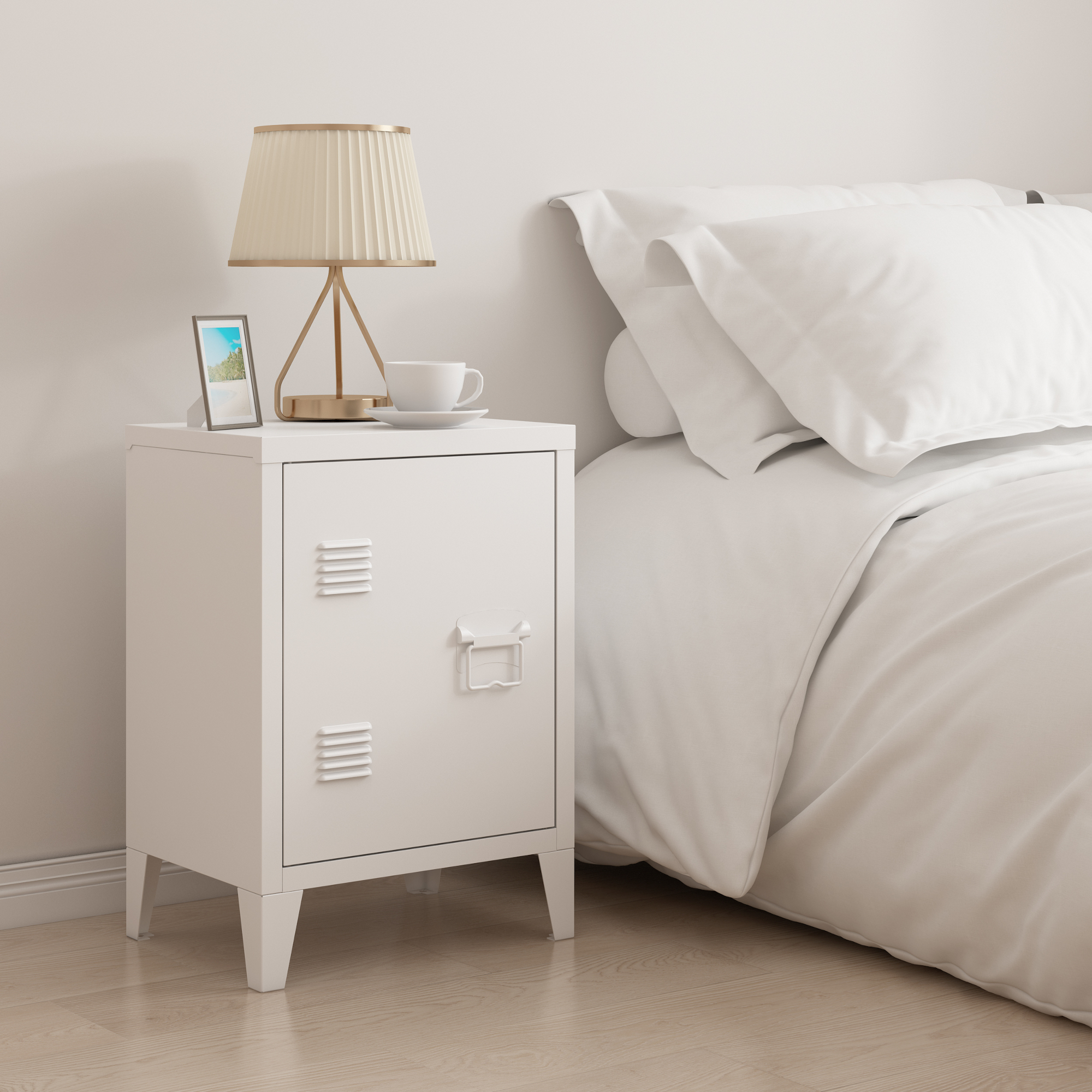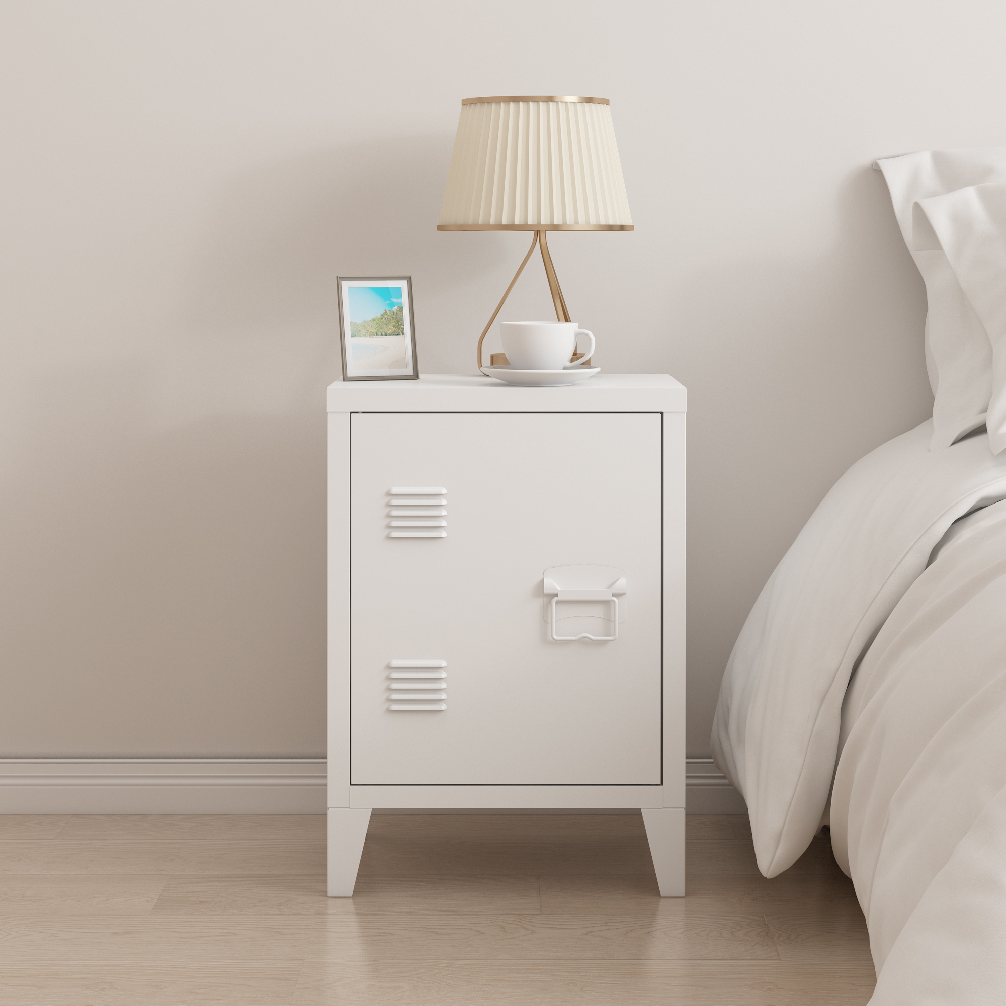 Descriere Noptieră metalică albă Inari ușă și