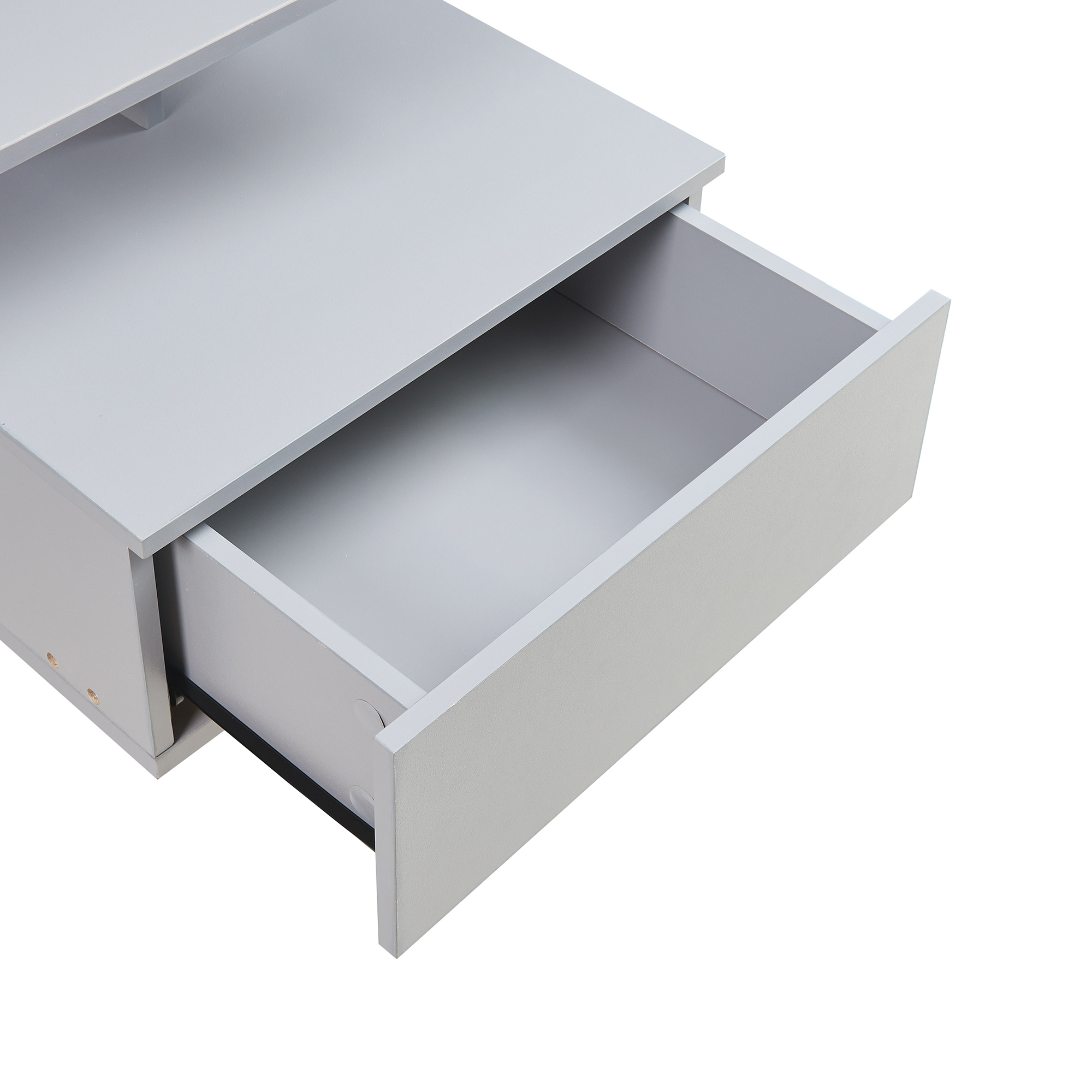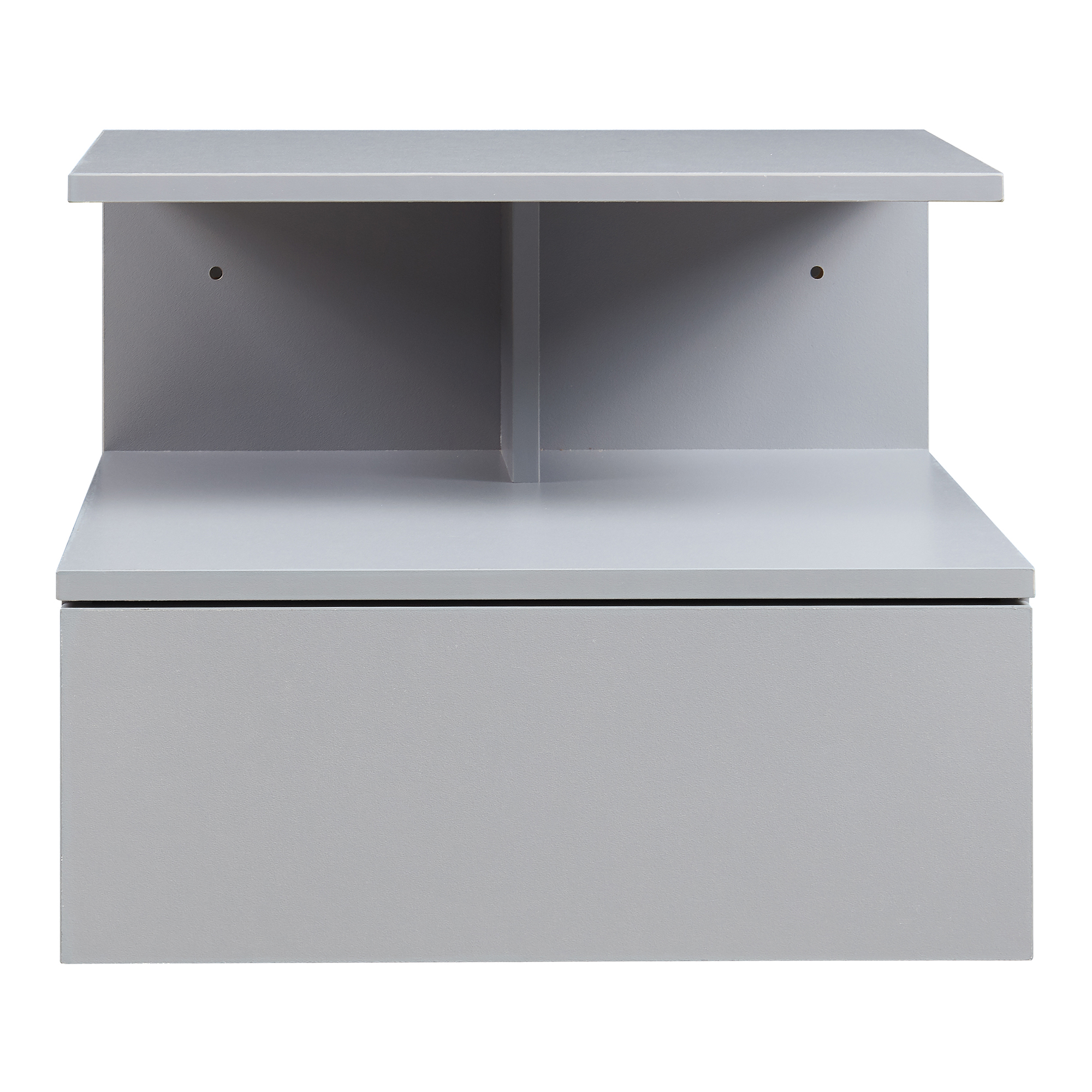Această noptieră suspendată gri este ideală lângă pat, montată la înălțimea dorită pentru confort maxim. Poate susține o veioză sau obiecte decorative pe polița superioară, în timp ce spațiul intermediar și sertarul păstrează la îndemână lucrurile importante. În hol, poate fi folosită ca suport elegant pentru chei, corespondență sau telefon.