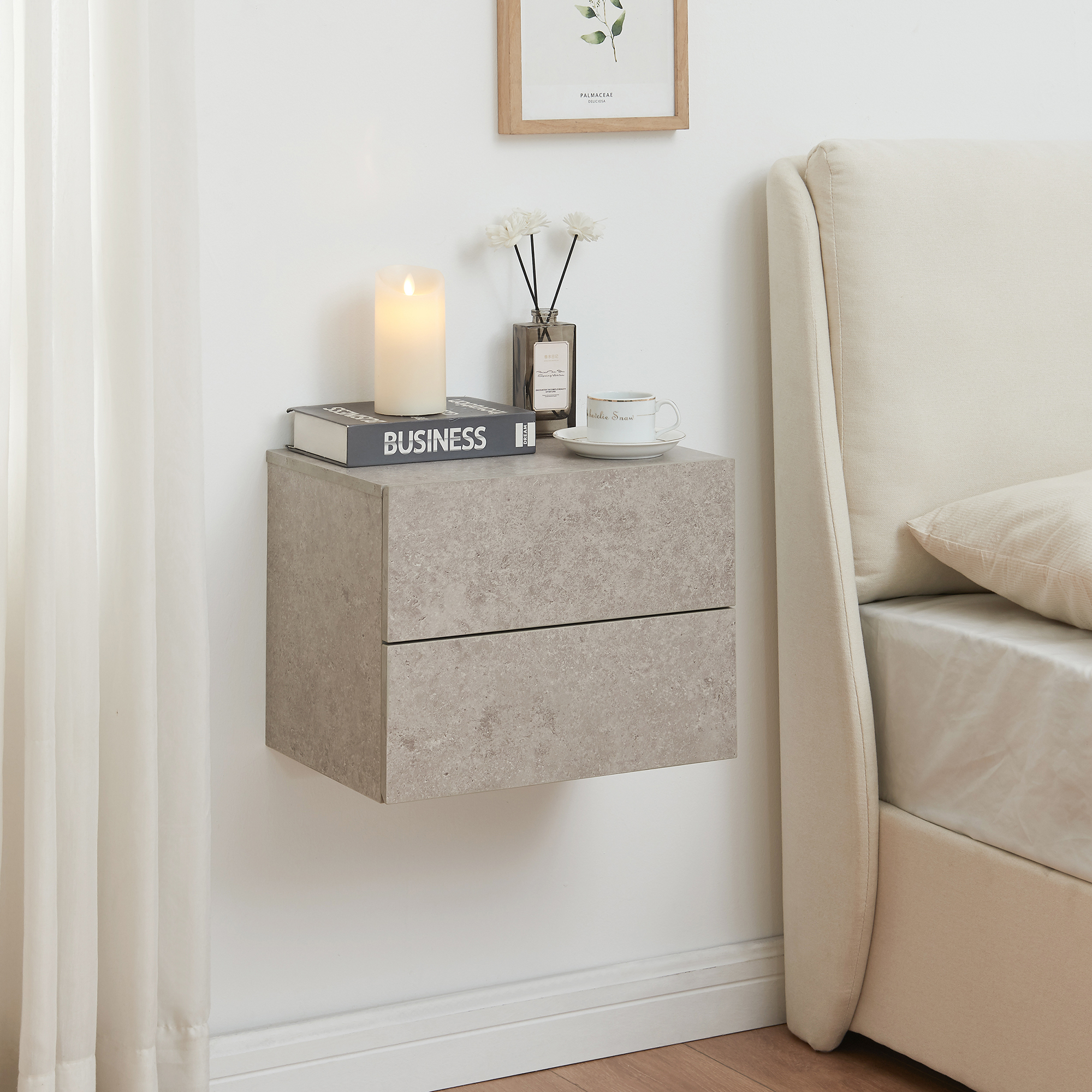 Noptieră suspendată Ampfing cu 2 sertare, aspect beton deschis