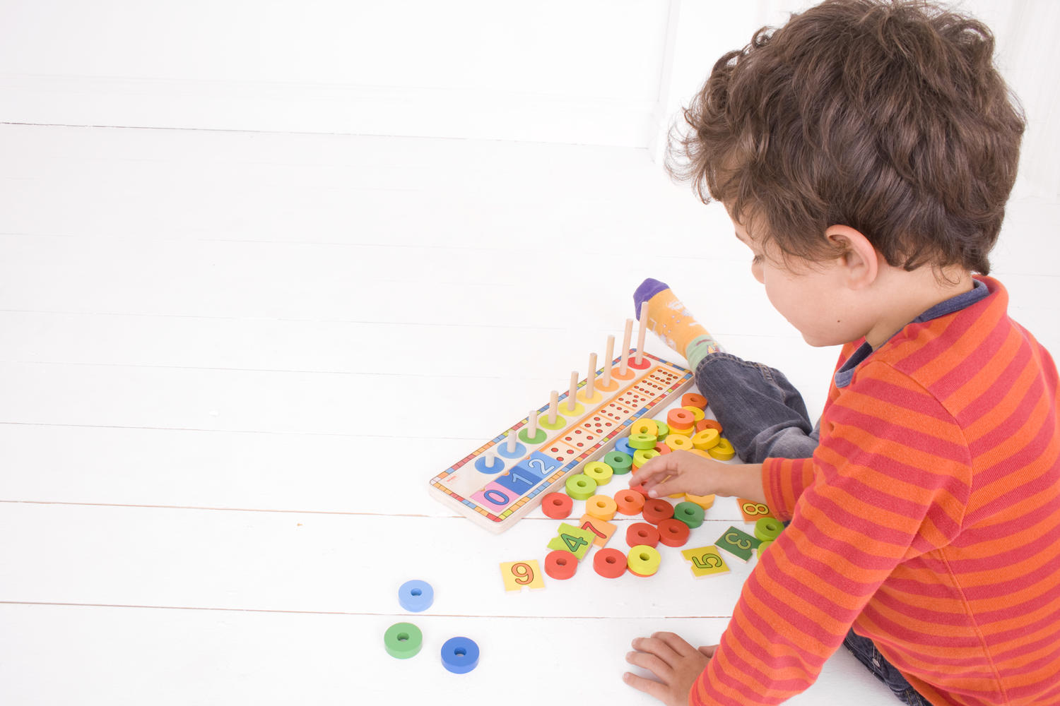 Mod de utilizare: copilul potriveste placutele cu cifre, numara discurile colorate si le aseaza pe fiecare tija in functie de numarul indicat. Este o metoda simpla si placuta de a exersa primele notiuni de matematica.