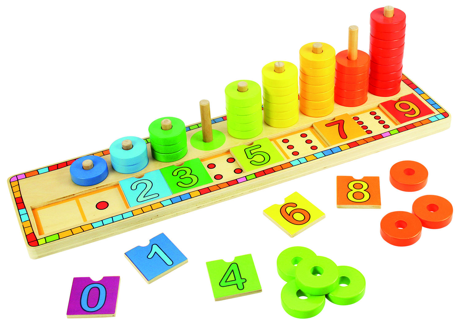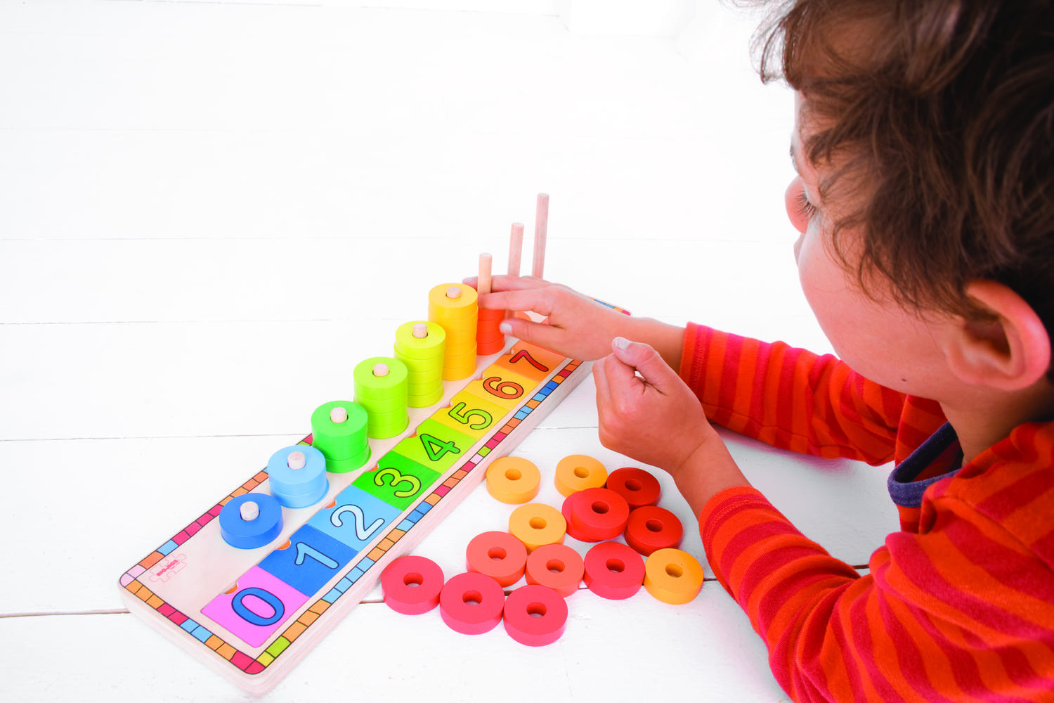 Copilul poate aseza discurile pe suporturile corespunzatoare si poate potrivi placutele cu numere de la 0 la 9. Atunci cand placutele sunt indepartate, sunt descoperite bulinele care il ajuta sa inteleaga vizual relatia dintre cifra si cantitate. Aceasta jucarie matematica din lemn contribuie la dezvoltarea logicii, coordonarii mana-ochi si atentiei.
