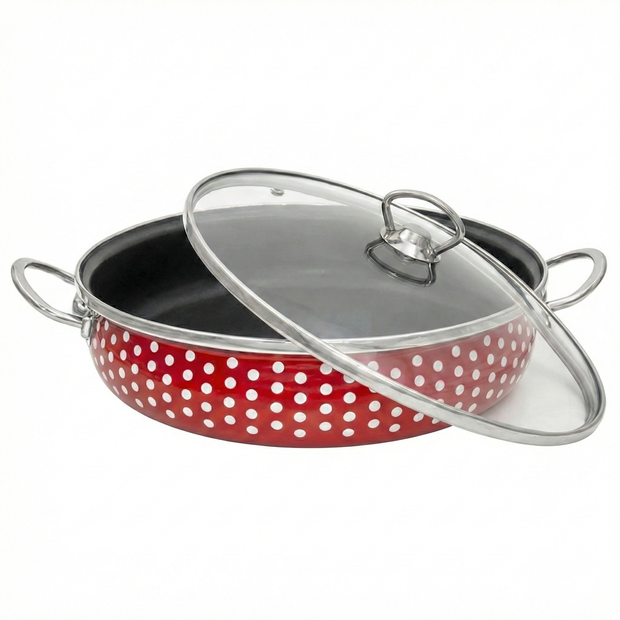 Oală tip tigaie emailată cu buline, antiaderentă, cu capac din sticlă – 26 cm, 2 L
