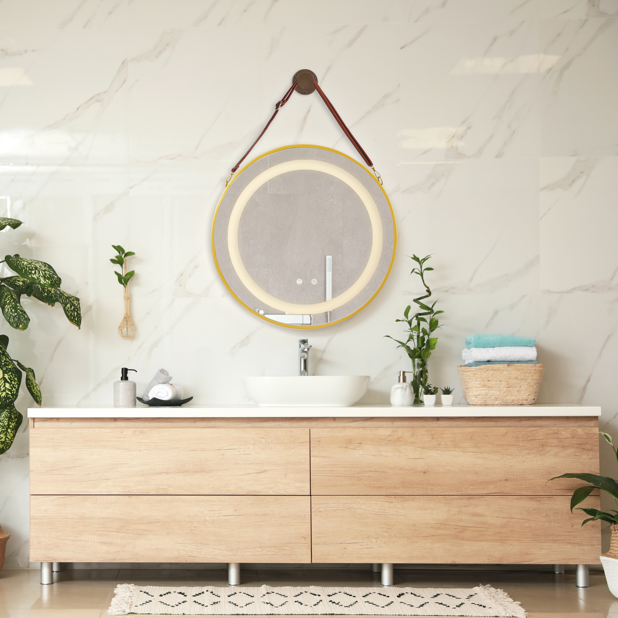 Oglindă baie LED rotundă Picerno 70 cm aurie este alegerea ideală pentru o baie modernă, elegantă și funcțională. Designul rotund, finisajul auriu și sistemul de prindere decorativ transformă această oglindă baie LED într-un element de efect, perfect pentru amenajări contemporane. Iluminarea integrată creează o atmosferă plăcută și oferă vizibilitate excelentă pentru rutina zilnică.