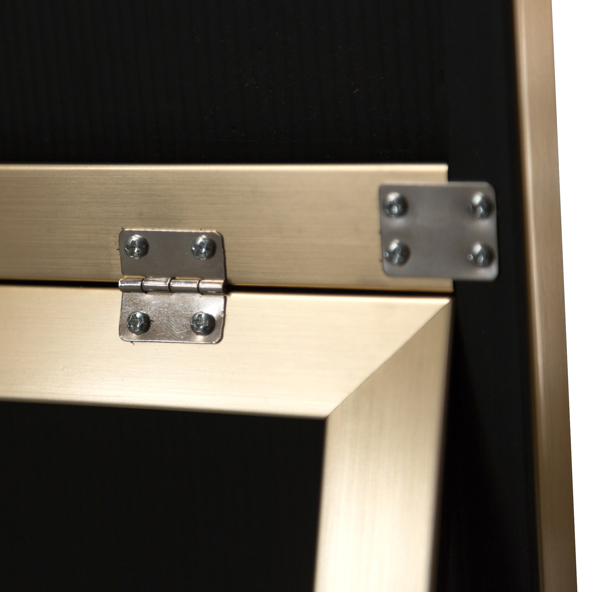 Datorită suportului stabil și reglabil, oglinda poate fi înclinată pentru un unghi de vizualizare confortabil. Rama în nuanță aurie adaugă un accent decorativ rafinat, iar formatul de oglindă întreagă este perfect pentru verificarea completă a ținutei înainte de plecare.