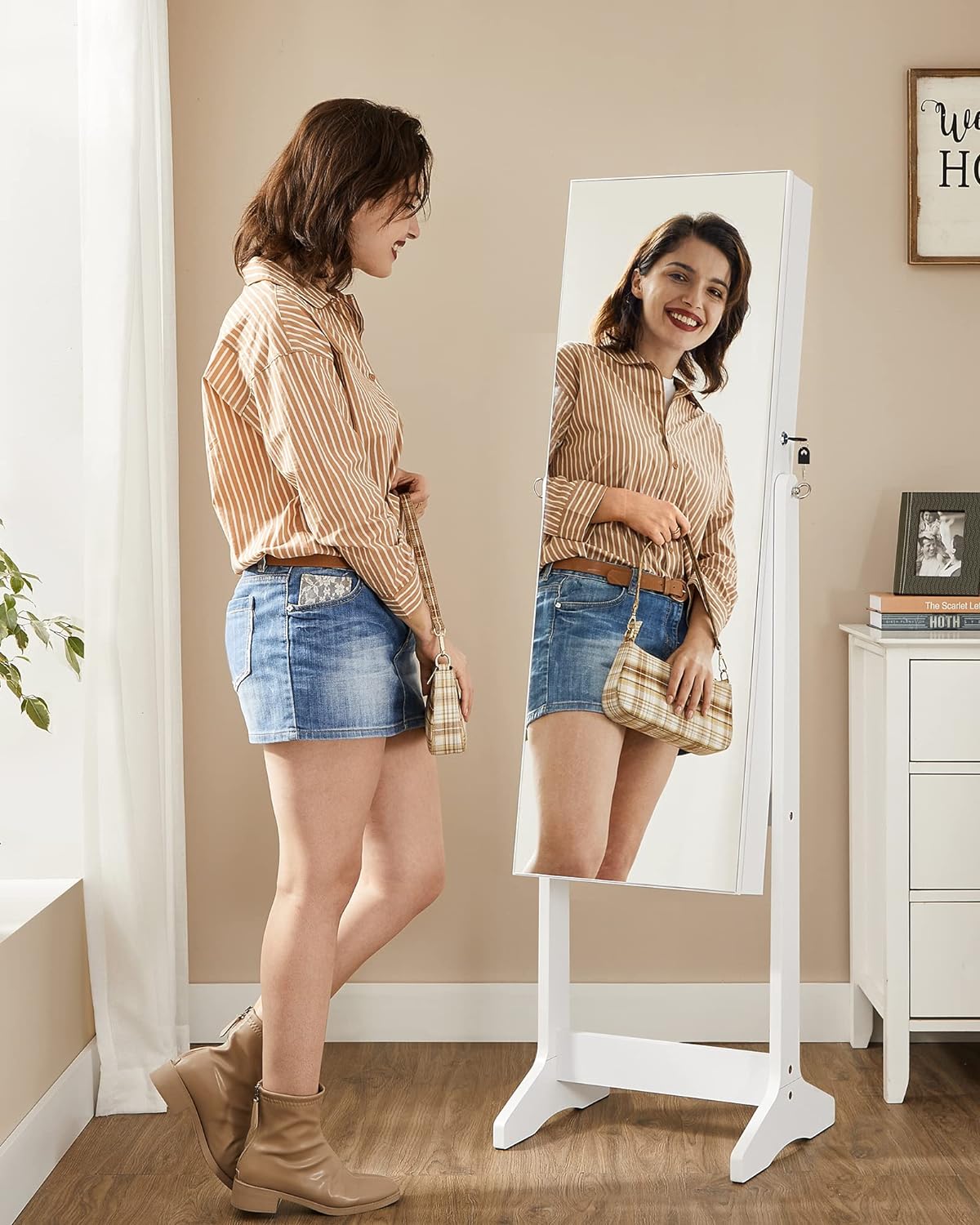 Alege o oglinda de podea cu dulap pentru bijuterii care imbina eleganta cu organizarea practica de zi cu zi. Acest model SONGMICS, in finisaj alb, are un design fara rama si o oglinda integrala perfecta pentru a te admira din cap pana in picioare, in timp ce interiorul generos te ajuta sa pastrezi ordonate bijuteriile si produsele cosmetice preferate.