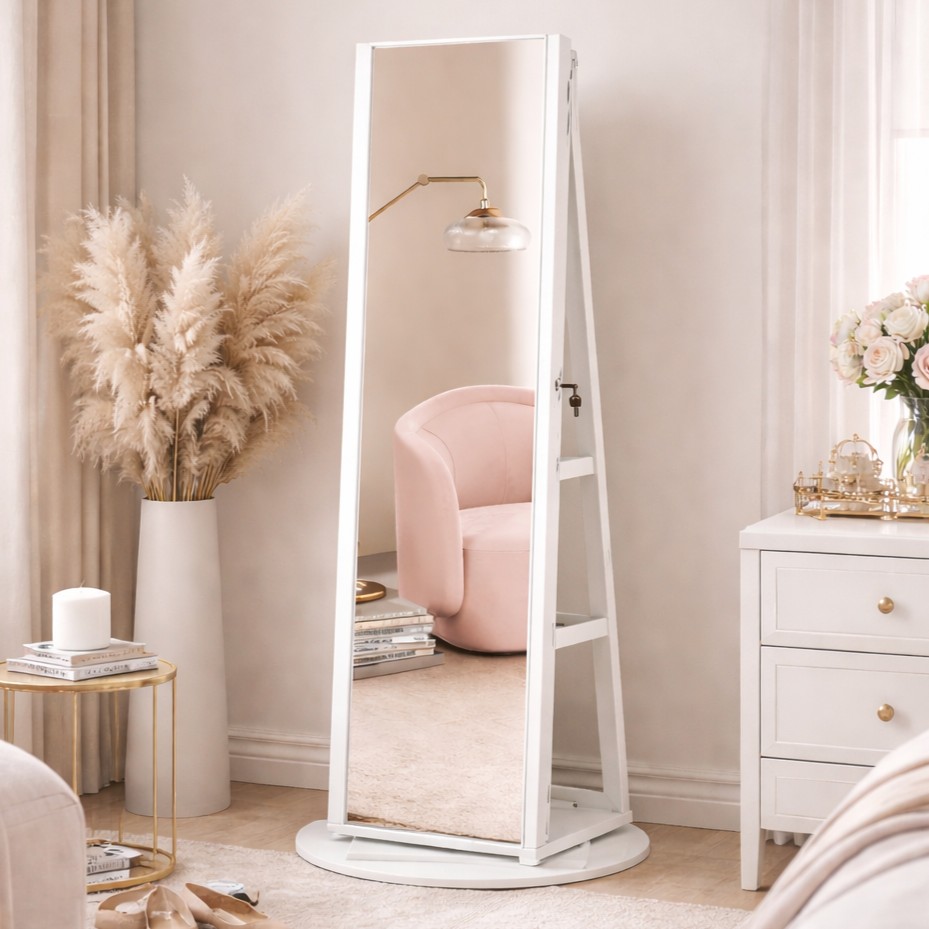 Transformă rutina zilnică într-un moment mai plăcut cu această oglindă de podea cu spațiu de depozitare de la SONGMICS. Designul elegant, finisajul alb și formatul vertical o fac potrivită pentru dormitor, dressing sau colțul tău de beauty. În spatele oglinzii full-length se află un compartiment bine organizat, ideal pentru păstrarea accesoriilor, iar sistemul de rotire 360° îți oferă acces rapid și confortabil din orice unghi.