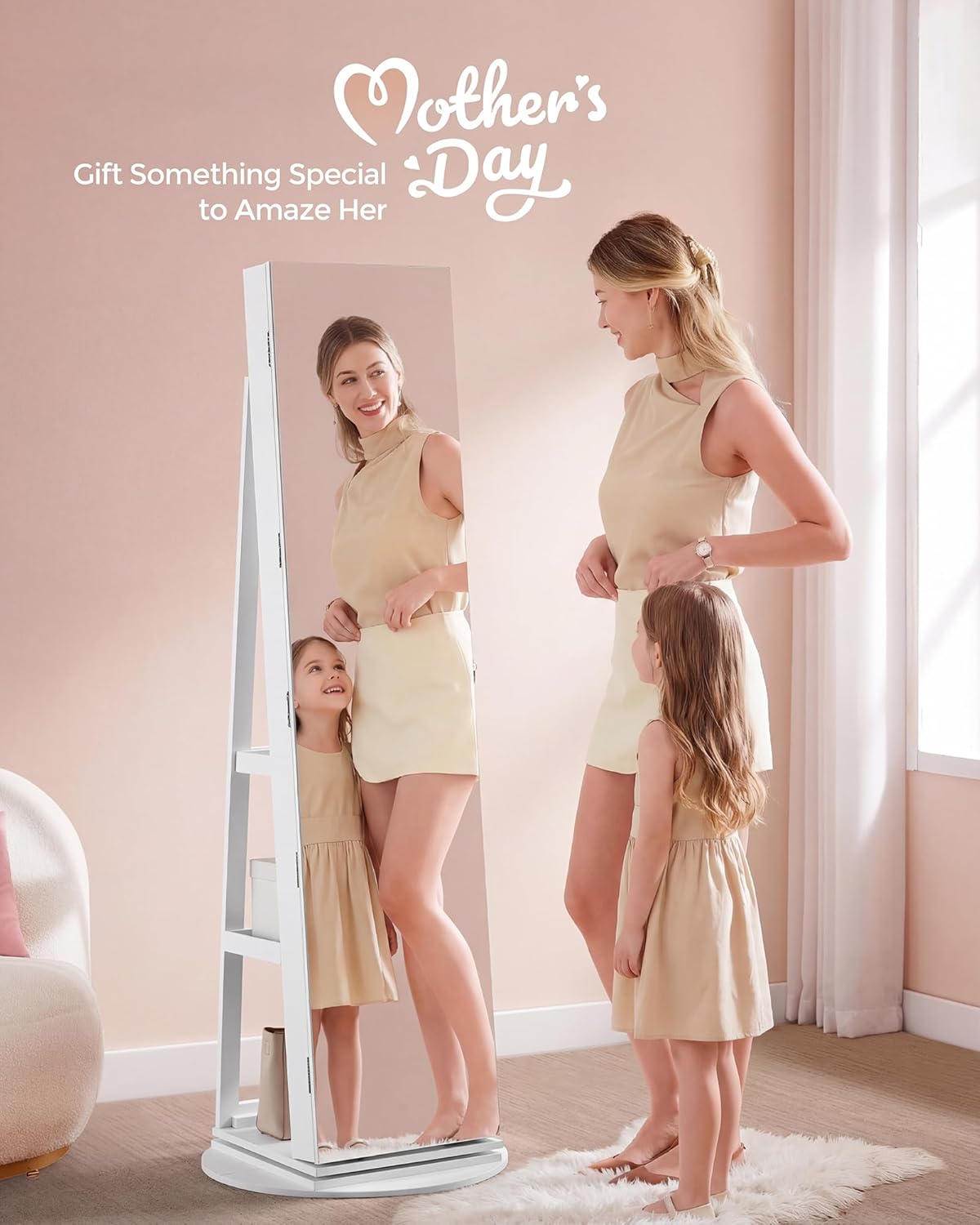 Oglindă de podea SONGMICS cu rotire 360°, LED și spațiu pentru bijuterii