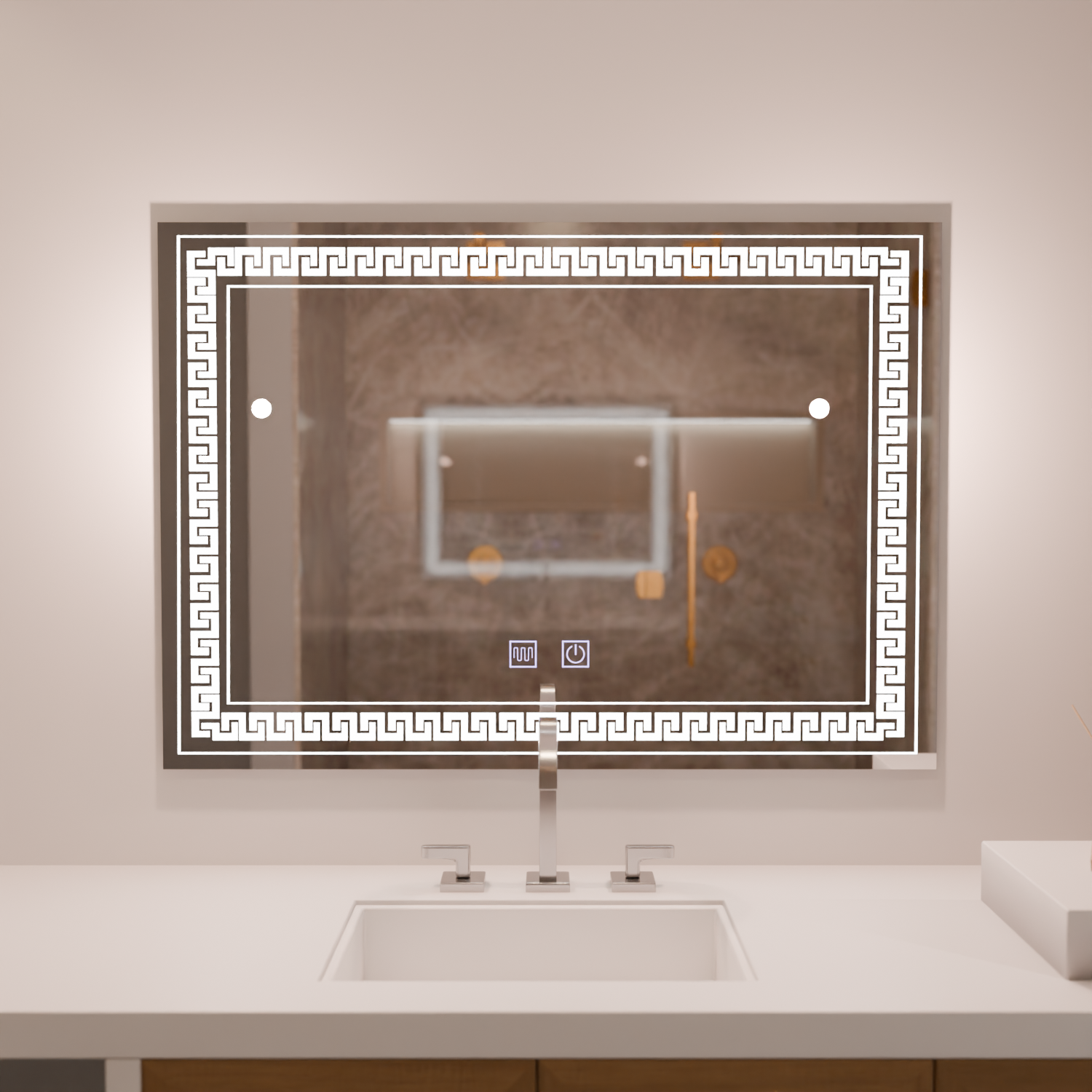 Utilizare: Pornește iluminarea din butonul touch și menține apăsat pentru a regla intensitatea (dimare). Activează funcția de dezaburire pentru a menține suprafața oglinzii curată și vizibilă în zone cu umiditate ridicată.