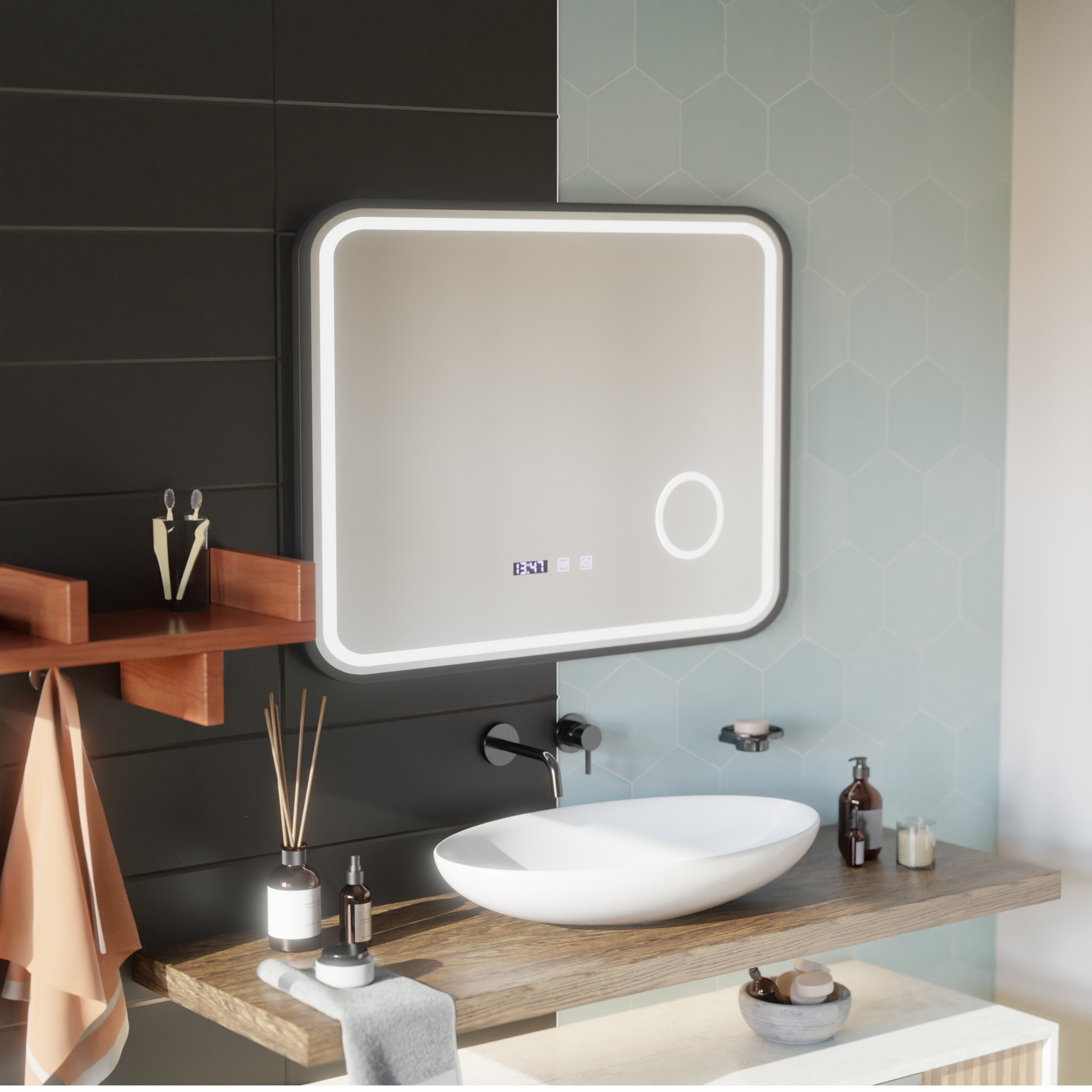 Oglinda LED Touch Bernd Sistem Dezaburire, Ceas si Temperatura 80x60 cm Rama Negru Brushed Lupa Cosmetica