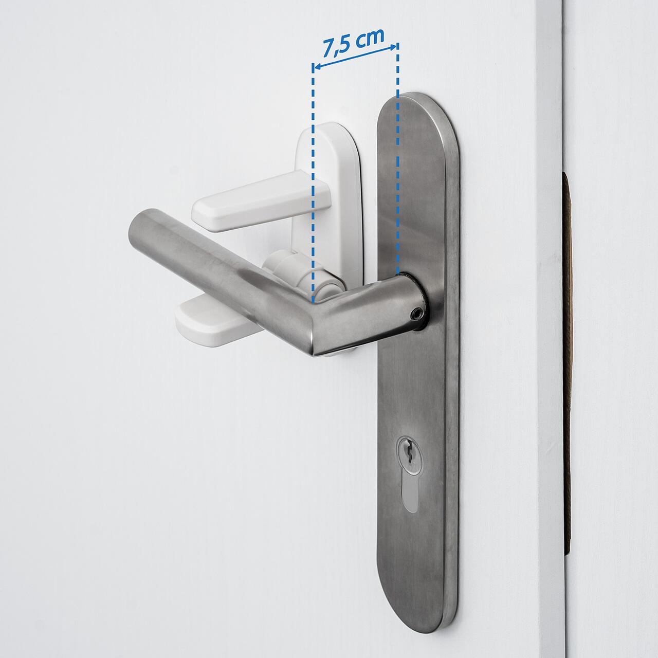 Dispozitivul de siguranta poate fi folosit pentru toate manerele usilor standard cu maner clasic (nu sunt potrivite pentru manerele sferice tip buton!), indiferent de design si material. Opritorul manerului usii se ataseaza direct de foaia usii. Este important ca distanta dintre foaia usii si maner sa nu fie mai mare de 7,5 cm. Prin urmare, dispozitivul de securitate poate fi utilizat pentru majoritatea usilor de interior si de exterior si ofera intotdeauna o protectie fiabila.