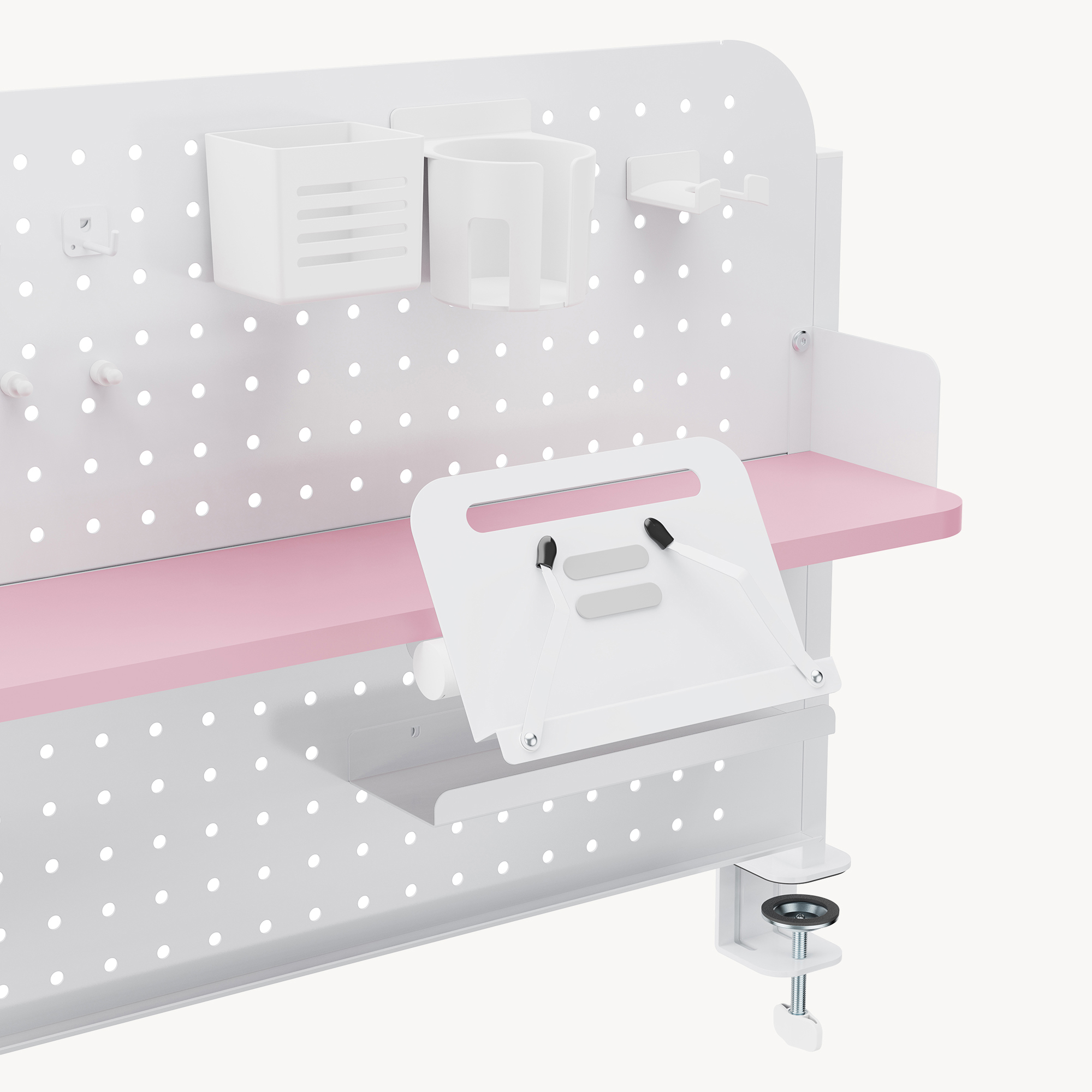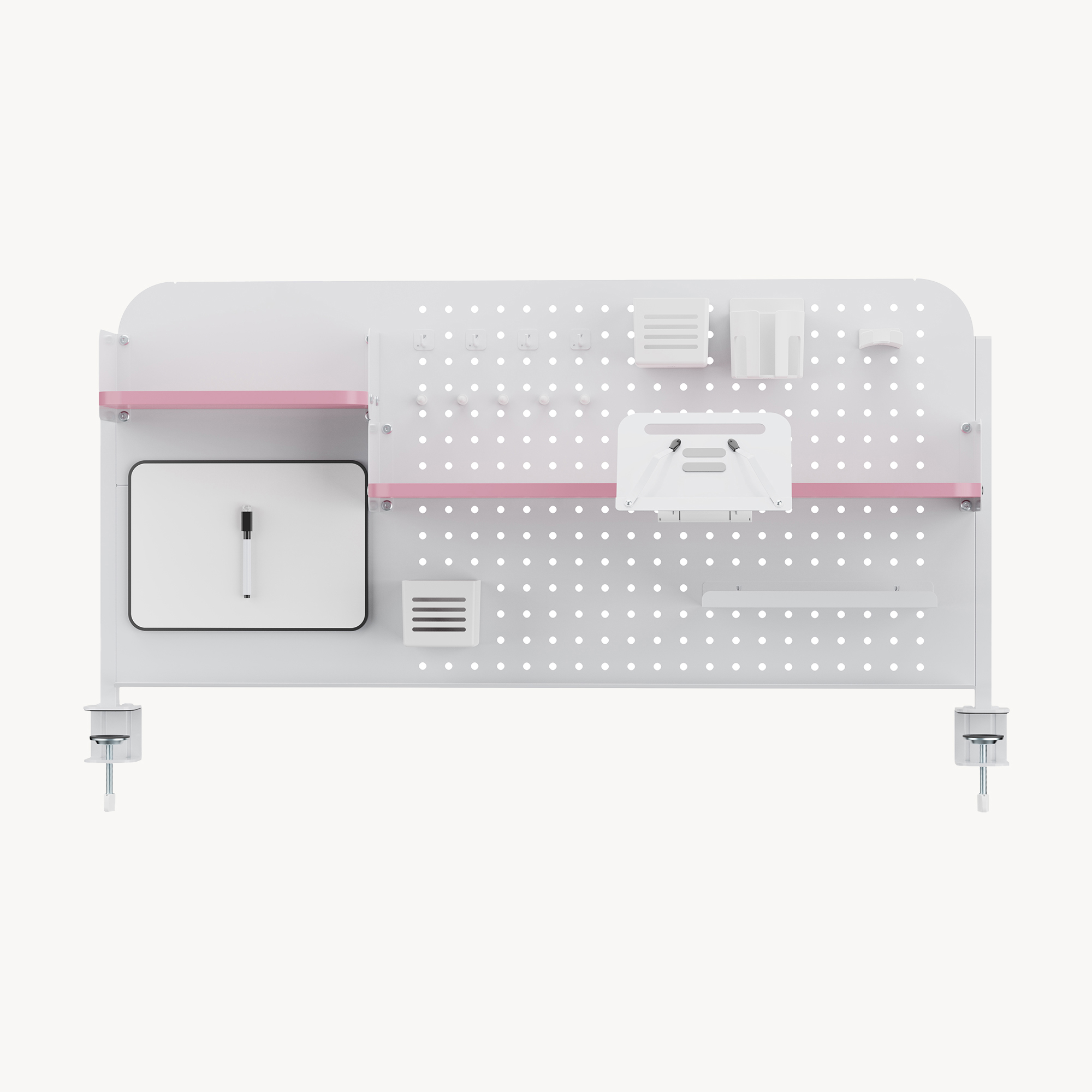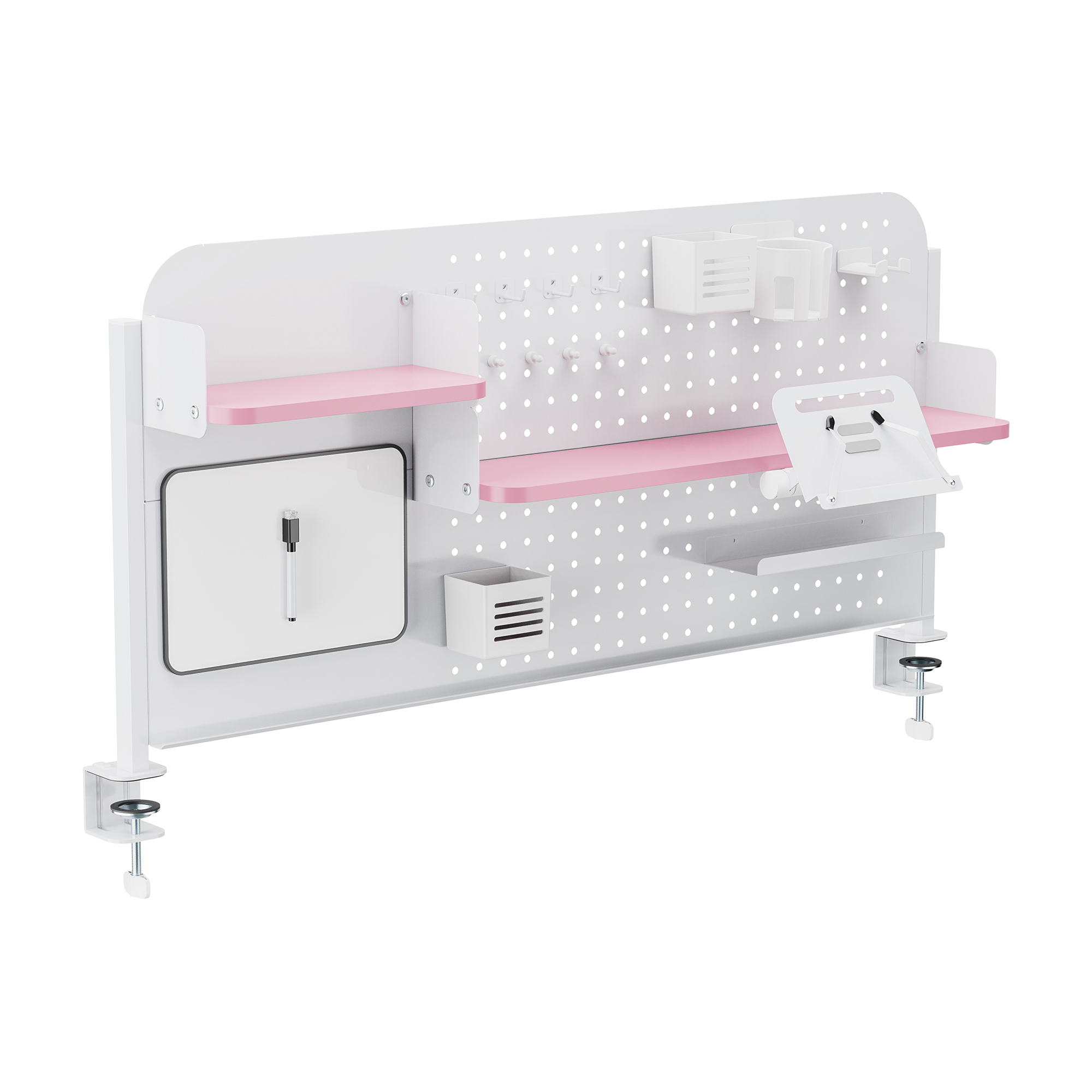 Panoul perforat generos permite o organizare flexibilă, iar accesoriile incluse te ajută să păstrezi la îndemână pixuri, căști, tabletă, notițe și alte obiecte importante. Designul în combinație alb/roz adaugă un aspect modern și plăcut, perfect pentru un spațiu de lucru aerisit și bine organizat.