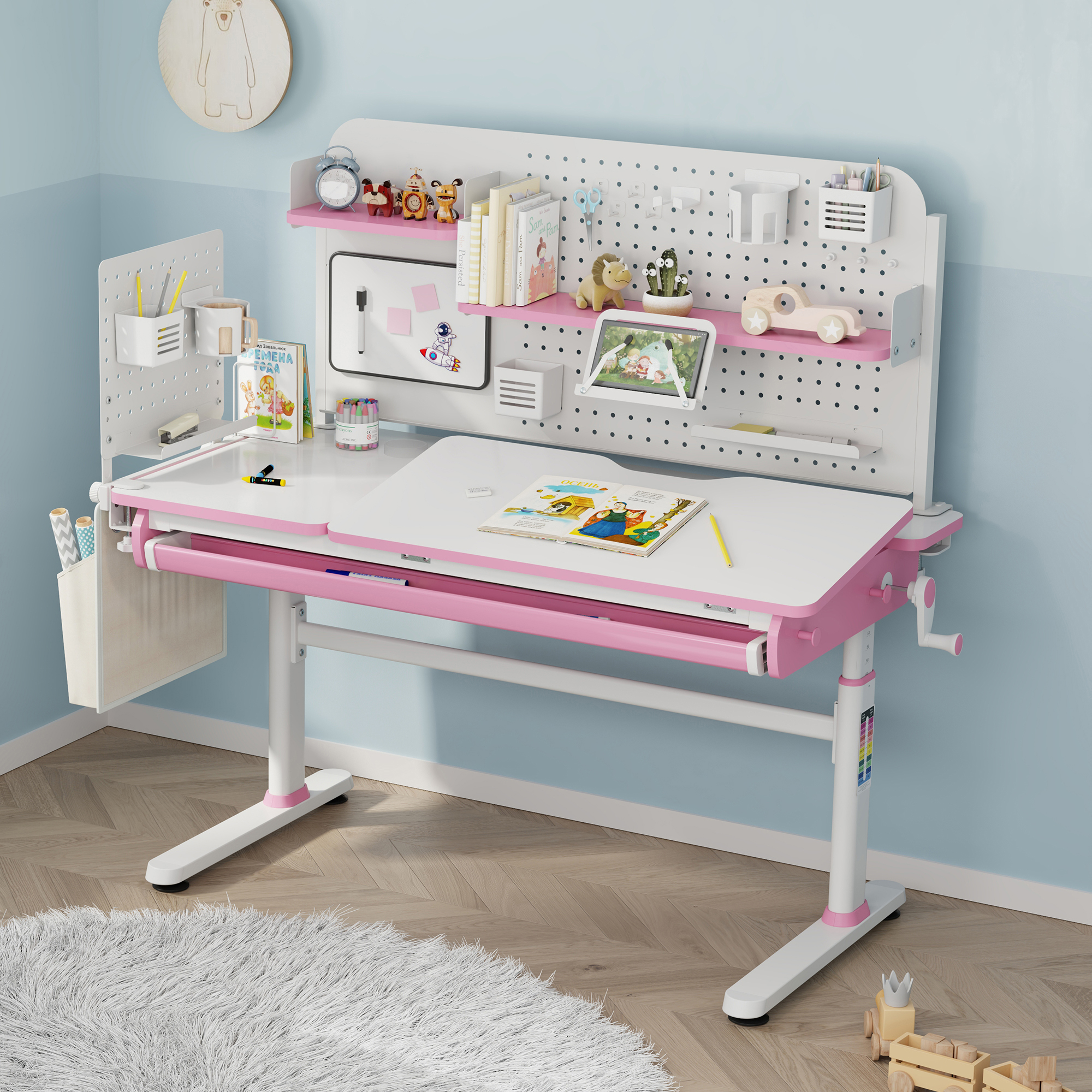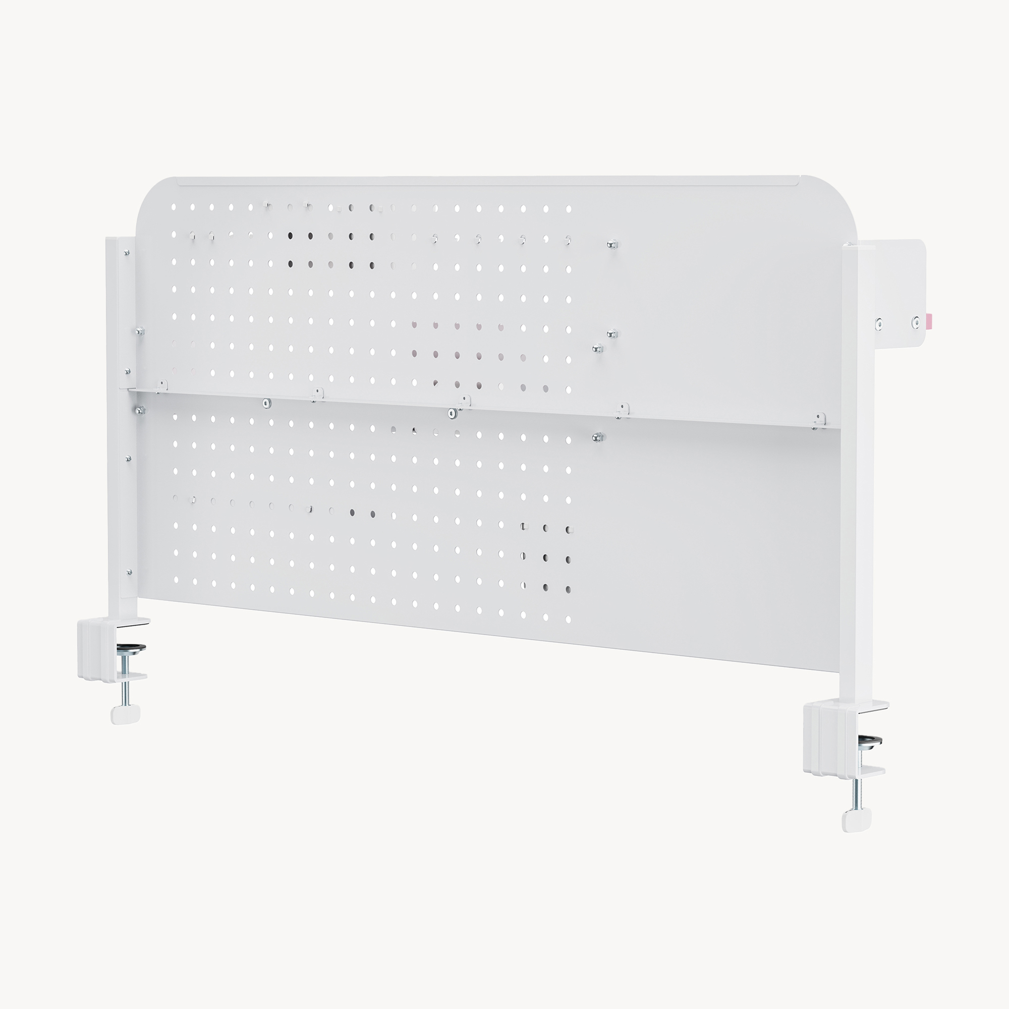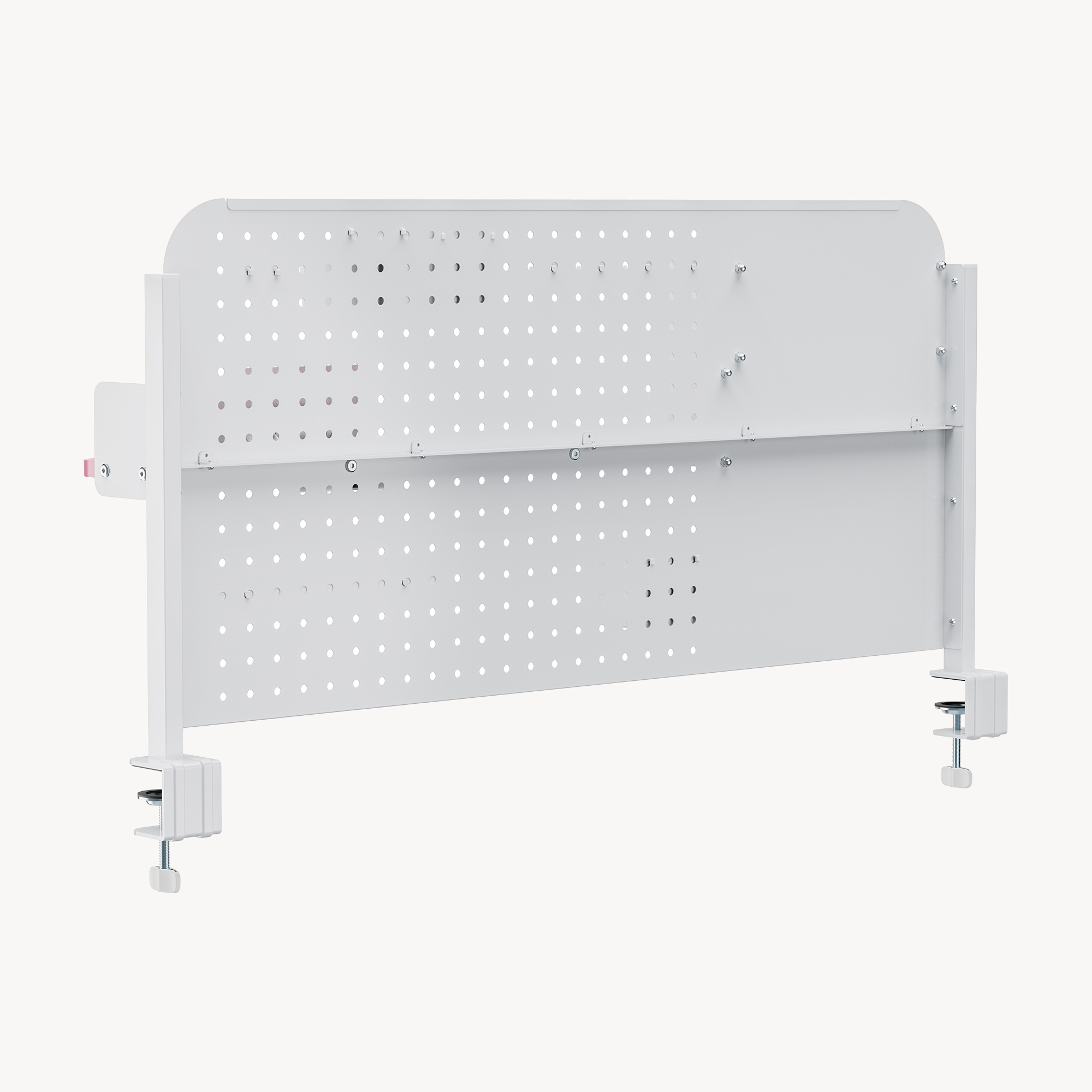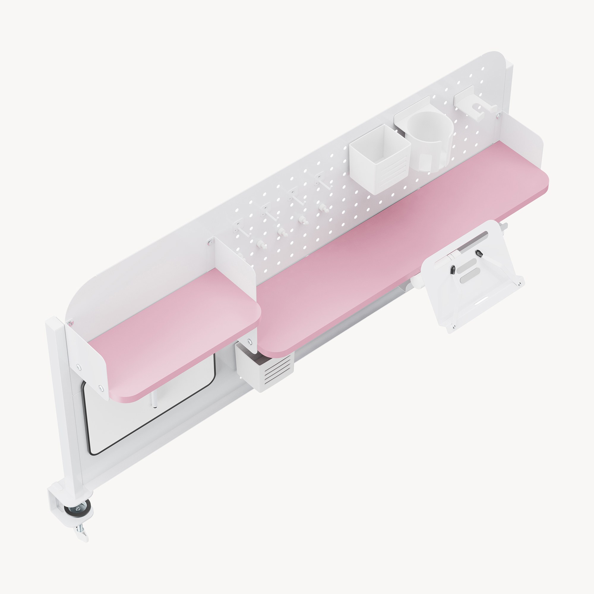 Panoul perforat generos permite o organizare flexibilă, iar accesoriile incluse te ajută să păstrezi la îndemână pixuri, căști, tabletă, notițe și alte obiecte importante. Designul în combinație alb/roz adaugă un aspect modern și plăcut, perfect pentru un spațiu de lucru aerisit și bine organizat.