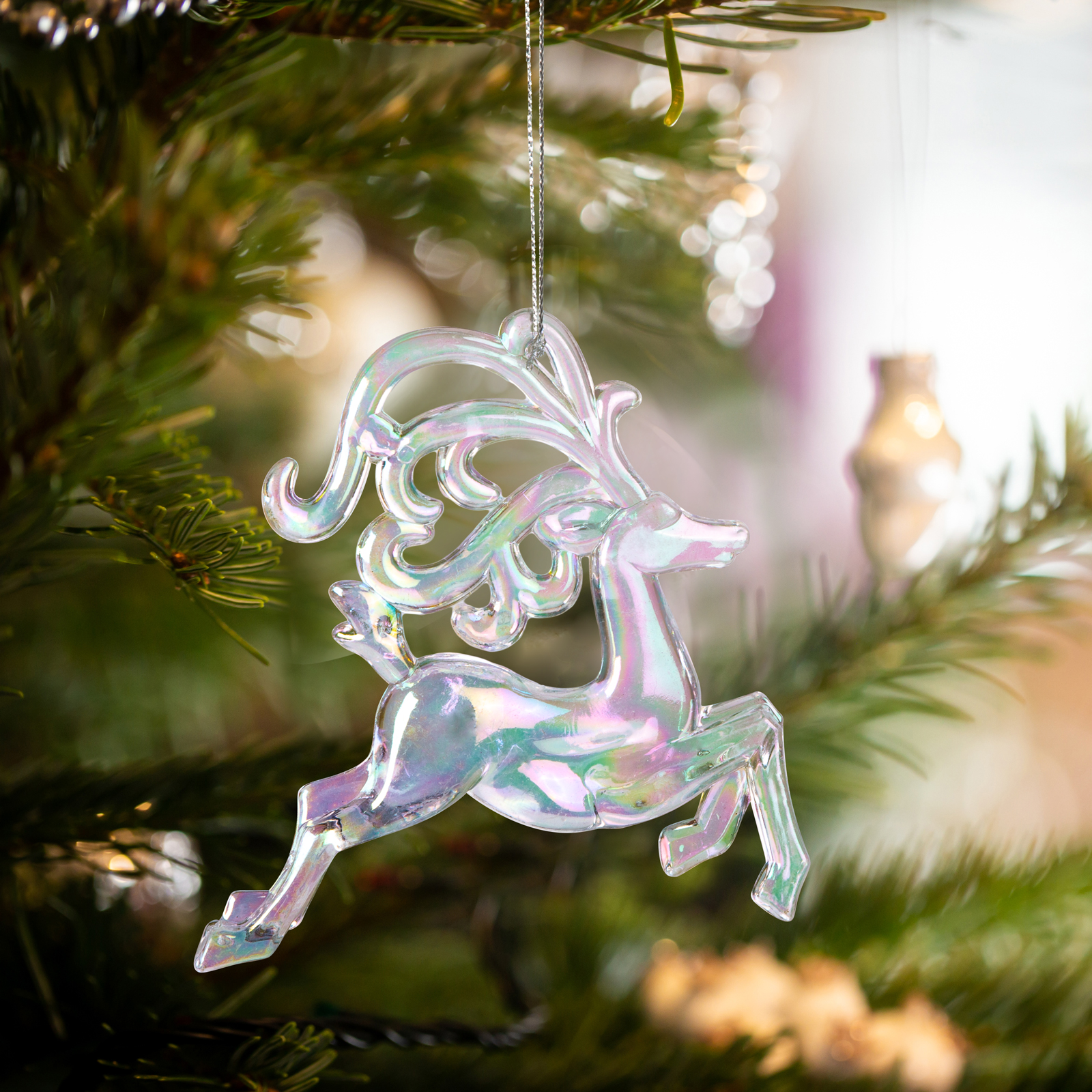 Acest ornament de Craciun este un ren cu efect deosebit, irizat, care va impodobi elegant bradul sau orice alt aranjament festiv. Ornamentul acrilic este ușor, dar durabil, astfel încât poate fi reutilizat an de an. Datorita efectului irizat, culorile ornamentului se schimba in functie de umbre si lumina. Datorită aspectului său elegant, acest decor de Crăciun poate fi și un cadou excelent pentru cei dragi sau prieteni.
