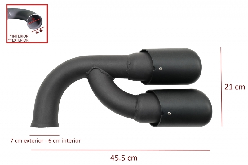 Ornamente evacuare GTS Design Matte Black Ornamentele sunt fabricate din otel inoxidabil de cea mai buna calitate Finisaj: Negru Mat Dimensions: Terminal End Pipe: 7 cm exterior - 6 cm interior Length: 45.5 cm Width: 21 cm Height: 10.5 cm