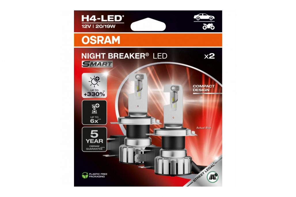 OSRAM NIGHT BREAKER LED SMART H4 64193DWNBSM-2HB20 Set 2 Becuri Auto Moto NIGHT BREAKER H4 LED, primul set H4-LED "street legal" de la OSRAM este acum pe piata. Acum, puteti face upgrade pentru faza lunga si scurta ale vehiculului dvs. la tehnologia LED de ultima generatie.