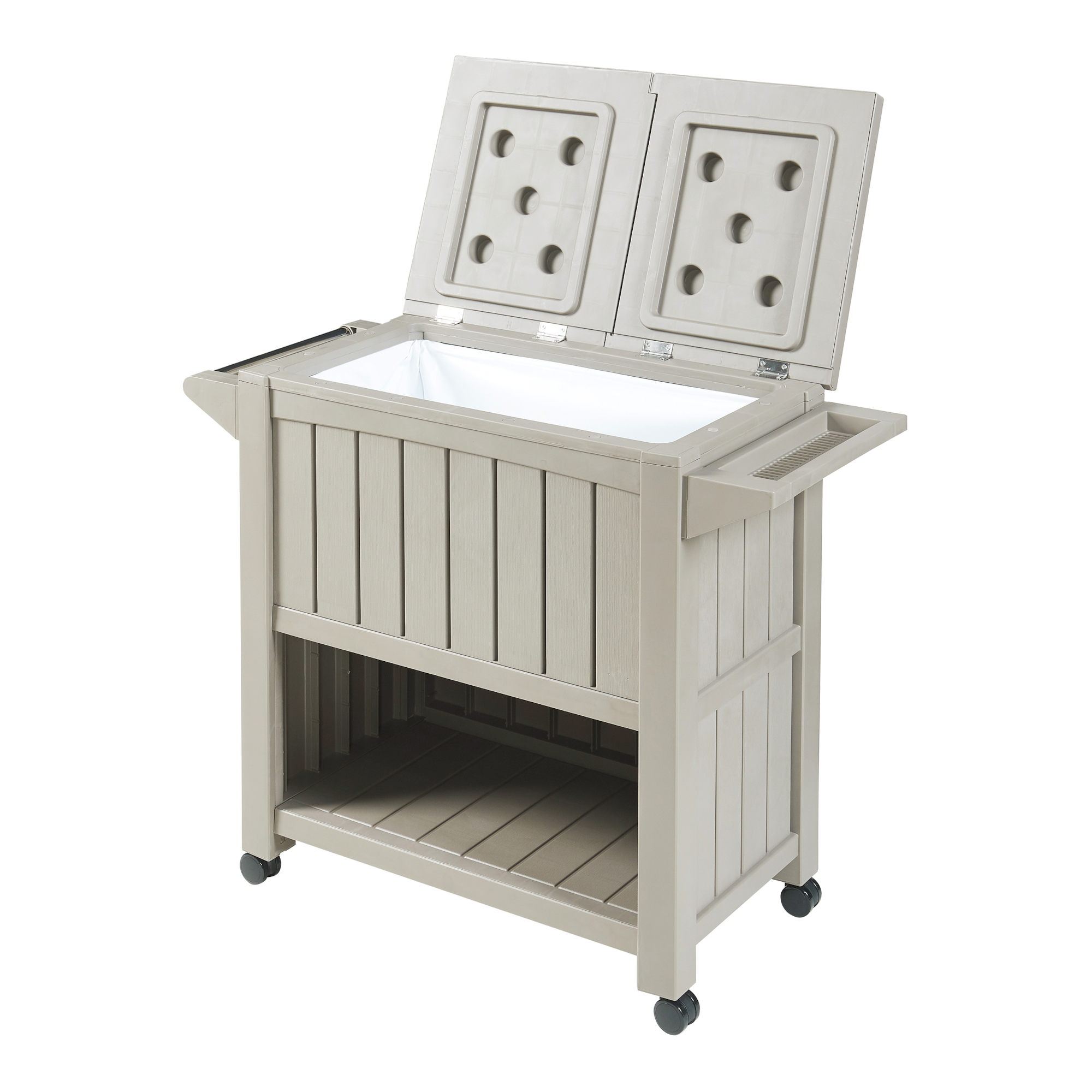 Der Servierwagen mit Holzmaserungsdesign bietet eine 3-in-1 Funktionalität: Er dient als Zubereitungsfläche, Aufbewahrungsmöglichkeit und Kühlbox. Mit zwei separat zu öffnenden Deckeln, die gleichzeitig als Tischplatte verwendet werden können, ist er äußerst praktisch und flexibel einsetzbar.