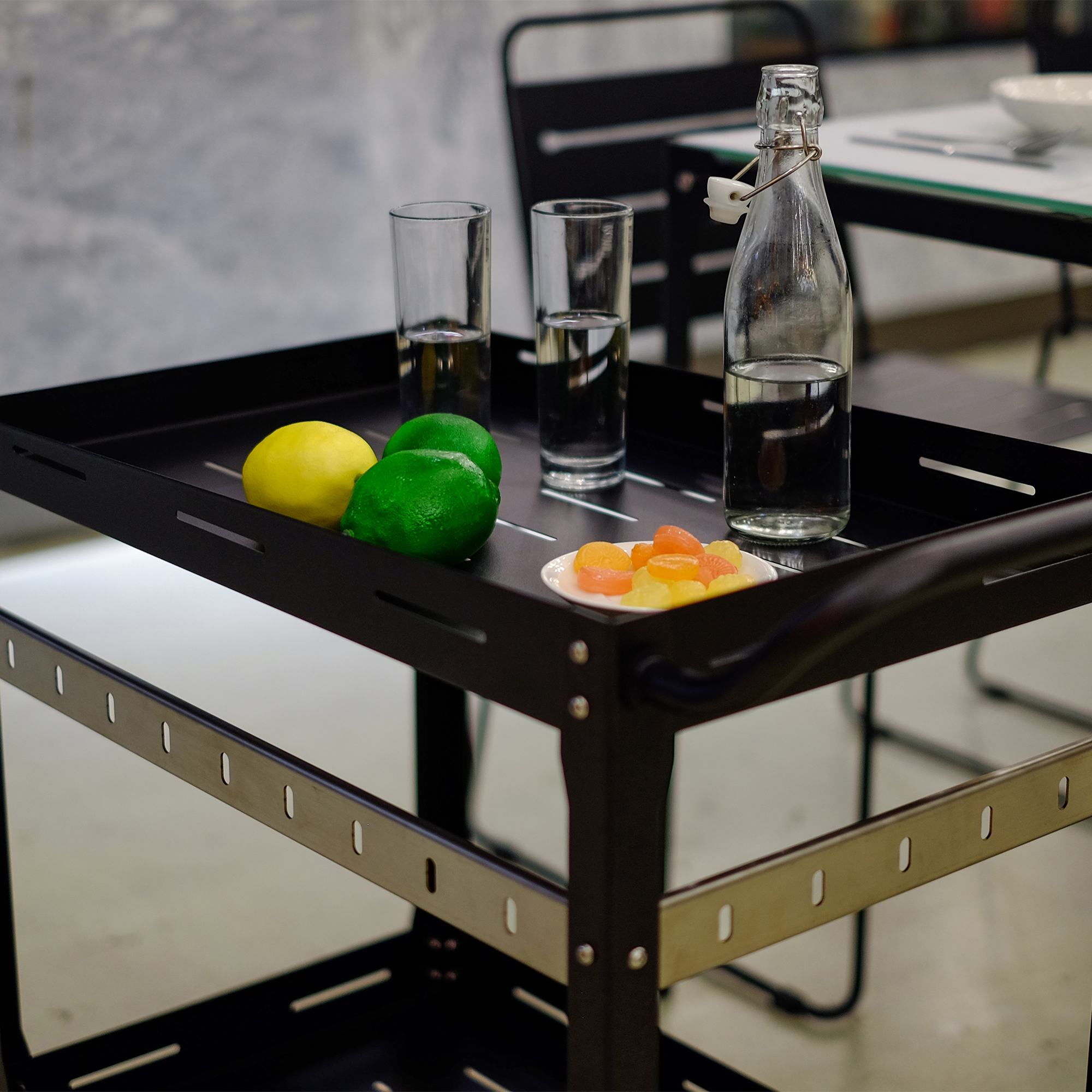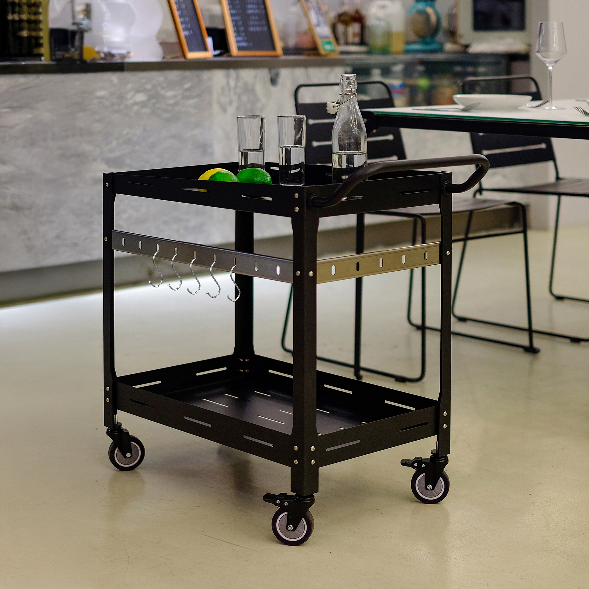 Mit zwei großzügigen Ablageflächen schafft der Wagen ausreichend Platz für Speisen, Getränke, Gläser, Teller und Snacks. Die stabile Bauweise gewährleistet, dass alles sicher verstaut ist und jederzeit griffbereit bleibt.