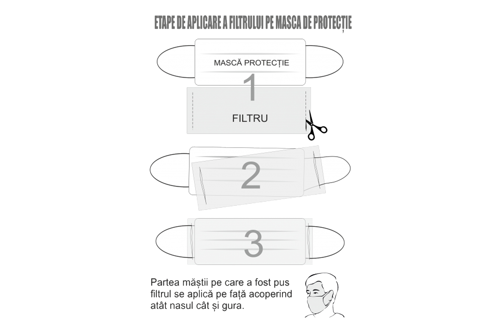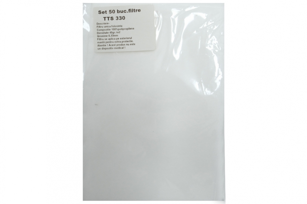 - dimensiuni: 20cm x 14.5 cm – filtrul se aplica pe interiorul mastii pentru extra protectie – grad mediu de protectie densitate 40gr.m2 grosime 0.33mm compozitie 100% polipropilena