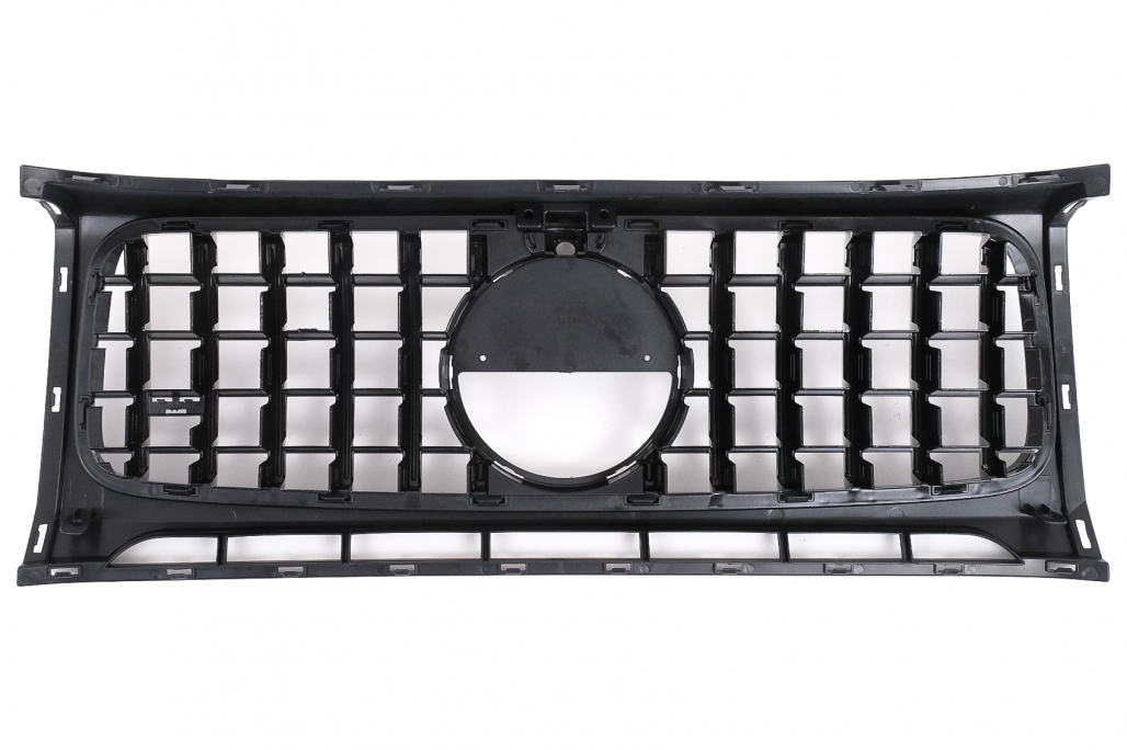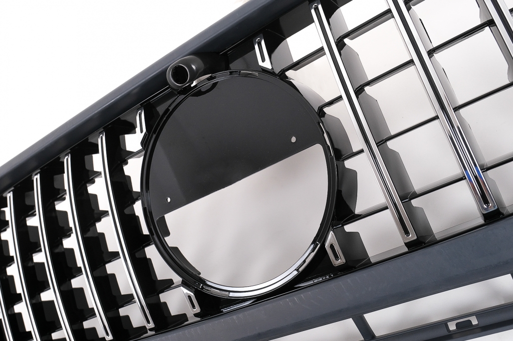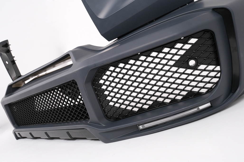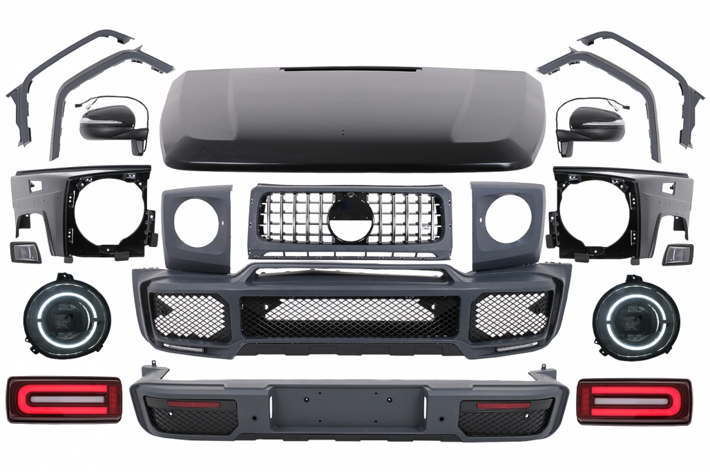 Acest kit exterior Mercedes W463 include principalele elemente necesare pentru un facelift complet: bară față, bară spate, grilă centrală GT-R Design, faruri LED, stopuri LED, oglinzi facelift, capotă, aripi laterale, prelungiri de aripi și bandouri. Este o soluție ideală pentru pasionații care își doresc un retrofit G-Class cu impact vizual puternic.